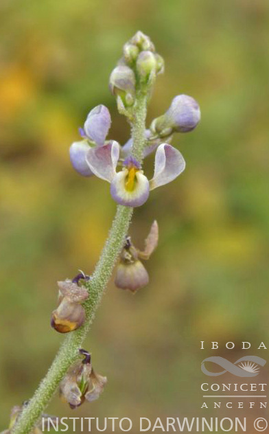 Hierbas de 13-90 cm de alto; tallos con pubescencia de tricomas glandulosos menores a 0,5 mm de largo. Hojas alternas; pecíolos de 2-3 mm de largo, pubescentes; láminas lanceoladas a oblongas, de 22-42 × 7-27 mm, ápice agudo a obtuso, mucronado, glabras o glabrescentes. Infl orescencias de 8-20 cm de largo; raquis pubescentes, nectarios extraflorales ausentes; brácteas triangulares, de 2-3,5 mm de largo, pubescentes; bractéolas de menor tamaño. Flores ca. 5 mm de largo, blancas a violáceas de ápice amarillento; pedicelos ca. 0,8 mm de largo; sépalos externos glabros; sépalo externo inferior elíptico, ca. 1,5-2 × 1 mm, ápice agudo; sépalos externos superiores elípticos, ca. 1,3 × 1 mm, ápice agudo; sépalos internos “alas” orbiculares, ca. 3,5 × 2,8 mm, ápice obtuso, glabros; quilla 3-lobulada ca. 3,8 mm de largo, pétalos laterales ca. 3 mm de largo, ápice obtuso, levemente pubescentes o glabros en la porción media adaxial, fusionados con la vaina estaminal; estambres 8, vaina estaminal ca. 2,5 mm de largo, porción libre de los filamentos estaminales separados entre sí en grupos de cuatro por una barra glabra en forma de capucha; ovario de contorno oblongo, ca. 1 × 0,9 mm, glabro; estilo curvo ca. 1,5 mm de largo, ensanchado distalmente, no auriculado, glabro, área estigmática con el lóbulo estéril agudo, lóbulo fértil 1-tuberculado. Fruto samaroide cordiforme, de 10-13 × 8-13 mm, simétrico, glabro. Semillas 2.