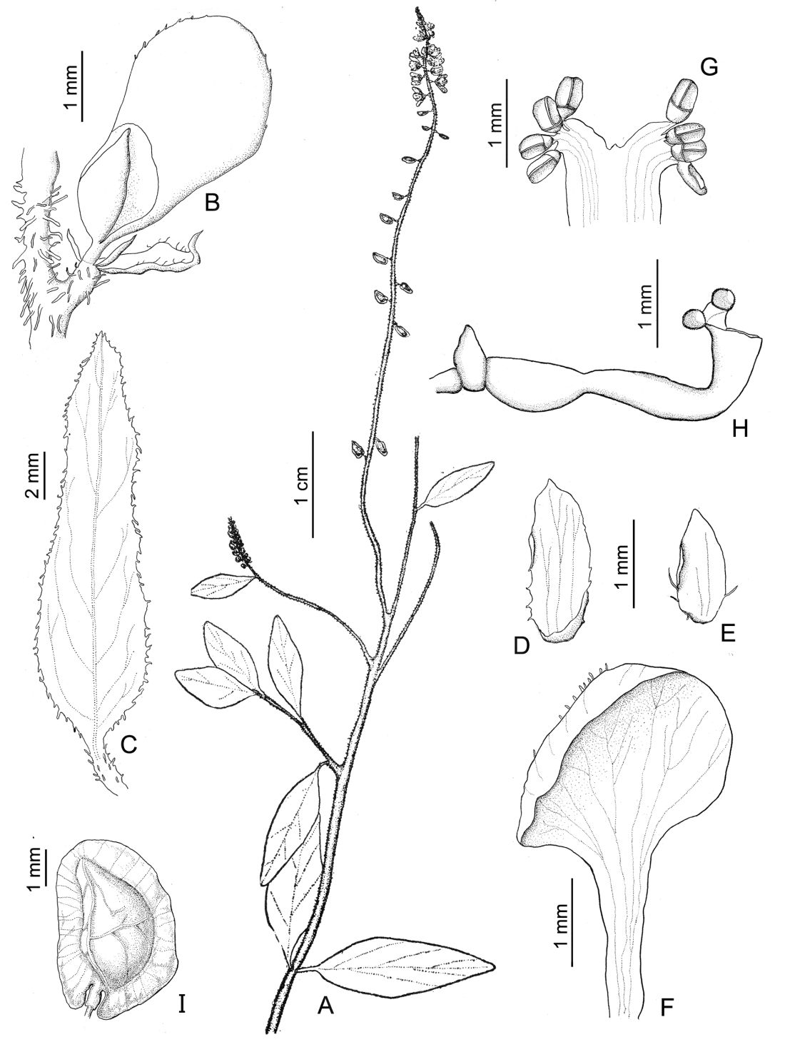 Hierbas de 30-45 cm de alto; tallos con pubescencia de tricomas glandulares menores a 0,5 mm de largo. Hojas alternas; pecíolos de 2-5,5 mm de largo, pubescentes; láminas lanceoladas, de 25-50 × 4-17 mm, ápice agudo, pubescentes. Inflorescencias de 16-18 cm de largo luego de fructifi car; raquis pubescente, nectarios extraflorales ausentes; brácteas lanceoladas, de 1,2-3 mm de largo, ciliadas; bractéolas de menor tamaño. Flores de 4-5 mm de largo, violáceas a rosadas; pedicelos ca. 0,6 mm de largo; sépalos externos glabros o pubescentes en los márgenes; sépalo externo inferior lanceolado, ca. 1,8 × 0,8 mm, ápice agudo; sépalos externos superiores lanceolados, ca. 1,5 × 0,6 mm, ápice agudo; sépalos internos “alas” elípticos, ca. 3 × 2 mm, ápice obtuso, glabros o pubescentes; quilla 3-lobulada, ca. 4 mm de largo, pétalos laterales ca. 3,5 mm de largo, ápice obtuso, pubescentes en la porción media adaxial, fusionados con la vaina estaminal; estambres 8, vaina estaminal ca. 2 mm de largo, porción libre de los filamentos estaminales separados entre sí en grupos de cuatro por una barra glabra hendida; ovario de contorno oblongo, ca. 1,5 × 0,5 mm, glabro; estilo curvo ca. 2 mm de largo, ensanchado distalmente, no auriculado, glabro, área estigmática con el lóbulo estéril agudo, lóbulo fértil 2-tuberculado. Fruto samaroide ovoide, ca. 4 × 3 mm, asimétrico, pubescente. Semilla 1.