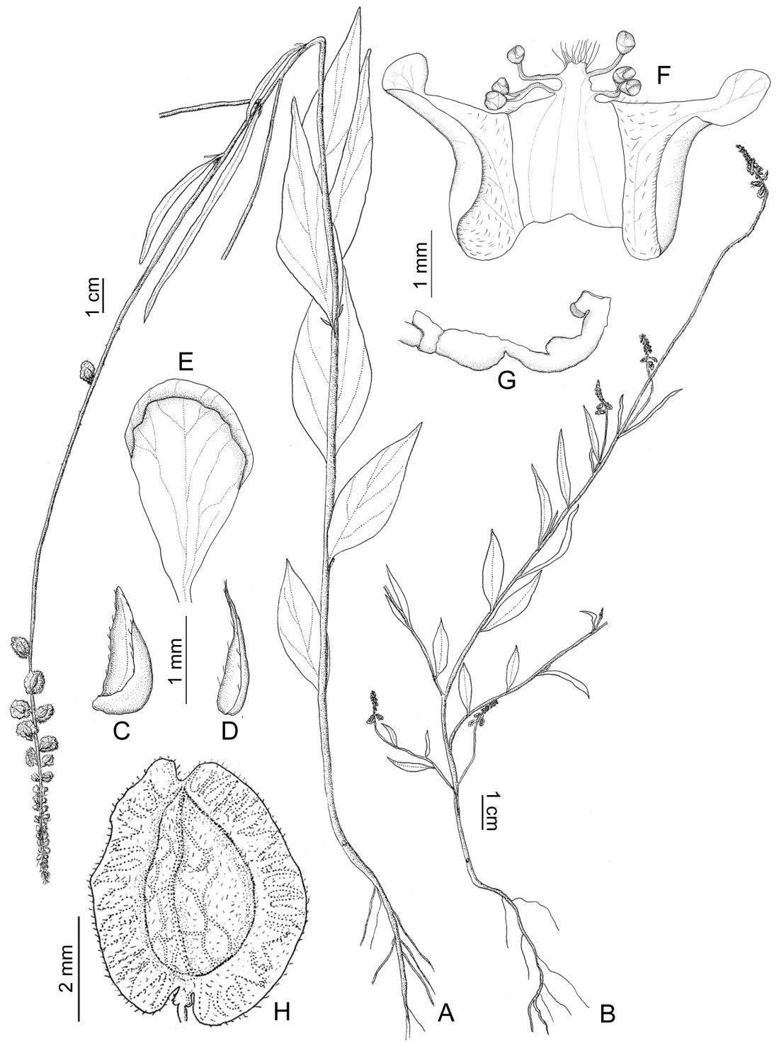Hierbas hasta de 100 cm de alto; tallos con pubescencia de tricomas estrigosos menores a 0,5 mm de largo. Hojas alternas; pecíolos de 1-2 mm de largo, pubescentes; láminas lanceoladas a lineares, de 25-72 × 2-29 mm, ápice agudo, glabrescentes. Inflorescencias axilares cleistógamas hasta de 3 cm de largo, las terminales casmógamas de 5,5-32 cm de largo; raquis pubescente, nectarios extraflorales ausentes; brácteas lanceoladas, ca. 3 mm de largo, pubescentes; bractéolas de menor tamaño. Flores de 4-5 mm de largo, azules o raro blancas y de ápice amarillento; pedicelos ca. 1 mm de largo; sépalos externos de margen pubescente; sépalo externo inferior lanceolado, ca. 2 × 1 mm, ápice agudo; sépalos externos superiores lanceolados, ca. 1,5 × 0,7 mm, ápice agudo; sépalos internos “alas” espatulados, de 2,5-3 × 2 mm, ápice obtuso, glabros; quilla 3-lobulada de 3-3,5 mm de largo, pétalos laterales de 2,5-3 mm de largo, ápice obtuso, pubescentes en la porción media abaxial, fusionados con la vaina estaminal; estambres 6, vaina estaminal de 1,7-2 mm de largo, porción libre de los filamentos estaminales separados entre sí en grupos de tres por una barra pubescente; ovario elipsoide, ca. 1,5 × 0,7 mm, pubescente; estilo curvo ca. 1,5 mm de largo, ensanchado distalmente, auriculado, glabro, área estigmática con el lóbulo estéril agudo, lóbulo fértil 1-tuberculado. Fruto samaroide, elipsoide, de 3-70 × 2,2-7 mm, asimétrico, glabro o pubescente.