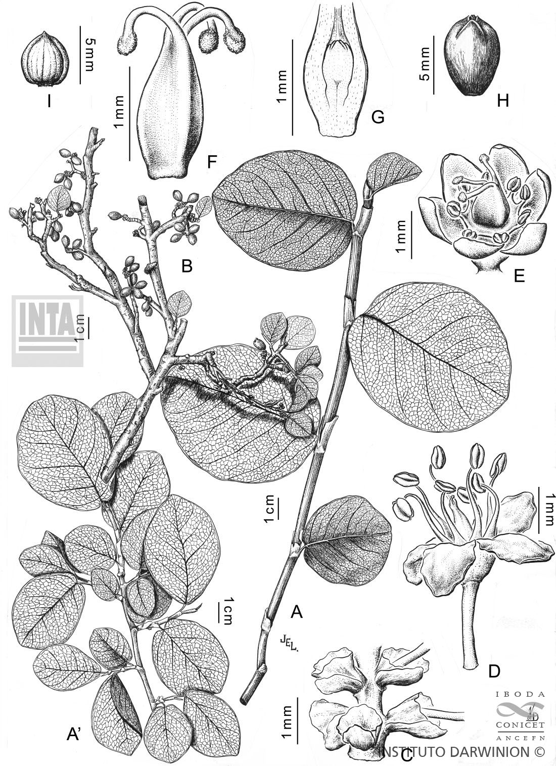 A-A’. Ramas en plena foliación. B. Rama proteranta, fructífera. C. Base de una inflorescencia mostrando las ocréolas. D. Flor estaminada. E. Flor pistilada. F. Gineceo. G. Ovario, corte longitudinal. H. Aquenio cubierto por el hipanto y los tépalos. I. Semilla.
