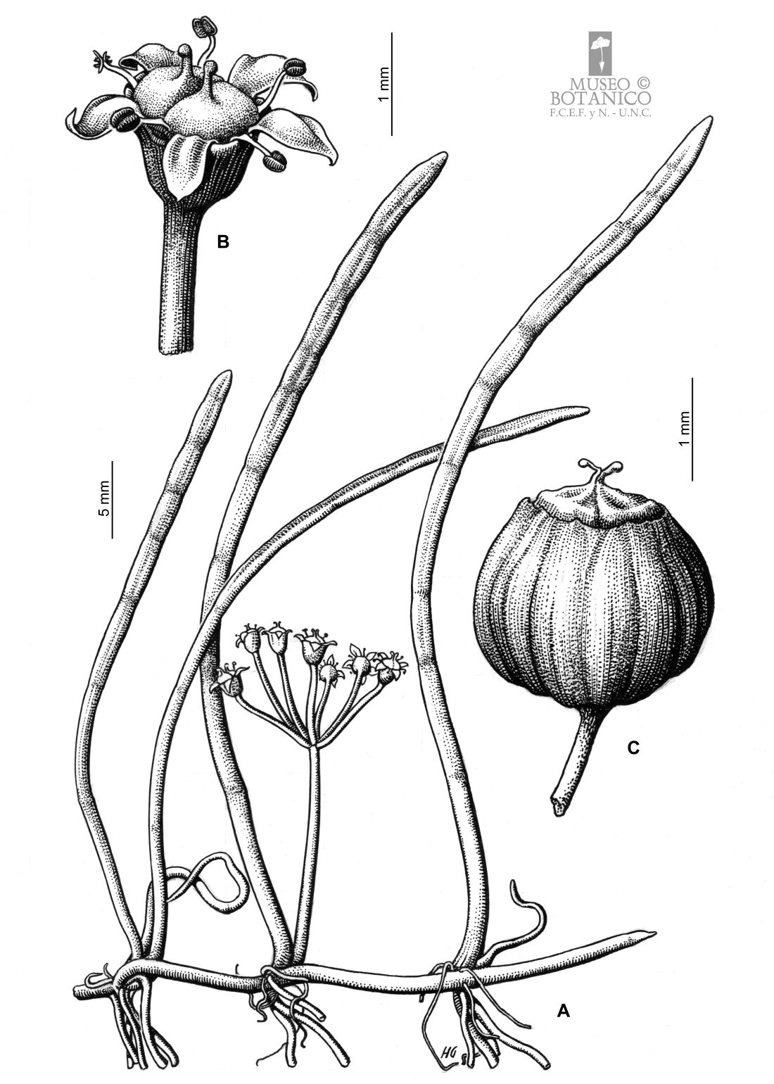 Rizomas de 0,2-1(-1,7) mm de diámetro, sin ramificaciones verticales. Hojas solitarias en los nudos del rizoma o, generalmente, acompañadas por un braquiblasto axilar de 1-3 hojas; espatuladas, oblanceoladas o menos frecuentemente lineares, de sección elíptica en la mitad inferior, planas en la porción distal, de 1-7(-12) cm de largo × 0,5-5 mm de ancho. Umbelas menores que las hojas; 3-8-floras, con pedúnculos de 0,2-1,5(-2,5) cm de largo. Flores blanquecinas o amarronadas. Frutos anchamente obovoides a globosos, de 1-1,9 × 1-1,9 mm; costillas primarias con tejido esponjoso, todas prominentes, triangulares en transección.