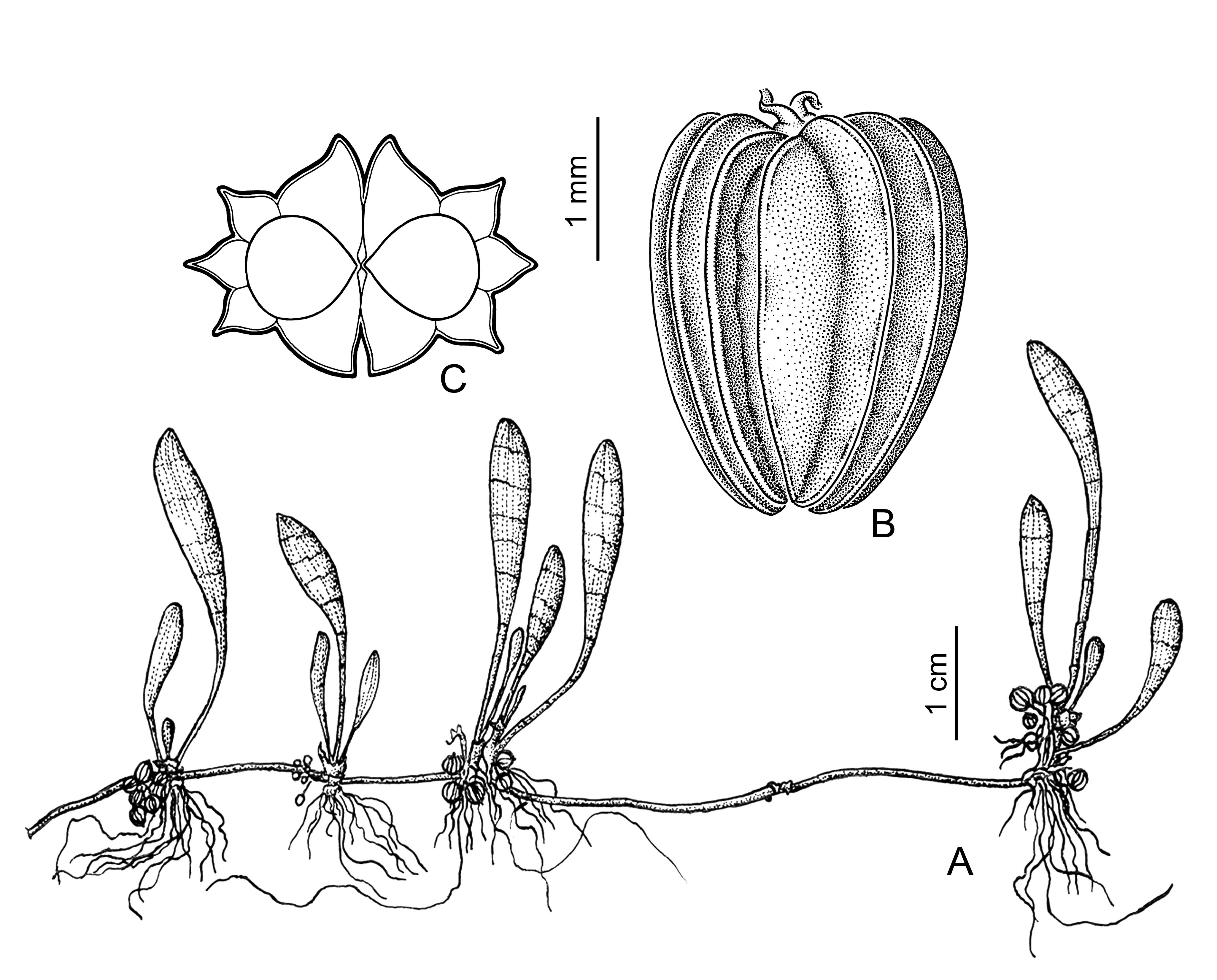 Rizomas de 0,2-1(-1,7) mm de diámetro, sin ramificaciones verticales. Hojas solitarias en los nudos del rizoma o, generalmente, acompañadas por un braquiblasto axilar de 1-3 hojas; espatuladas, oblanceoladas o menos frecuentemente lineares, de sección elíptica en la mitad inferior, planas en la porción distal, de 1-7(-12) cm de largo × 0,5-5 mm de ancho. Umbelas menores que las hojas; 3-8-floras, con pedúnculos de 0,2-1,5(-2,5) cm de largo. Flores blanquecinas o amarronadas. Frutos anchamente obovoides a globosos, de 1-1,9 × 1-1,9 mm; costillas primarias con tejido esponjoso, todas prominentes, triangulares en transección.