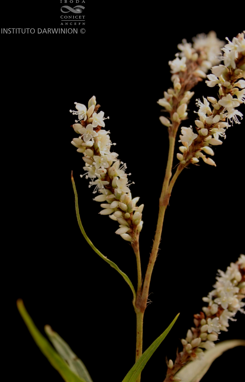Hierbas perennes, de 0,5-2 m de alto; tallos frecuentemente sumergidos en la base, glabros, estrigosos en la región infranodal. Hojas pecioladas; pecíolos breves (a veces ausentes), de 2-5(-20) mm de largo, articulados a la ócrea, estrigosos; láminas ovado- a lineal-lanceoladas, de 6-23 × 0,8-4 cm, de ápice agudo y base atenuada, a veces levemente cordada, concoloras, epifilo e hipofilo glabros a seríceos, con pelos cortos y rígidos en el borde y sobre el nervio medio en el envés. Ócreas cilíndricas, de 1-4 cm de largo, frecuentemente hendidas sobre la articulación del pecíolo, con cara externa estrigosa a densamente pilosa y borde ciliado. Inflorescencias en cincinos multifloros, de (4-)6-13 flores, formando al agruparse tirsos espiciformes densos, de 3-10 × 0,5-1,5 cm, dispuestos sobre pedúnculos estrigosos de 0,5-5 cm de largo; brácteas infundibuliformes, de 2-5 mm de largo, glabras a estrigosas, de borde ciliado; bractéolas 2-lobadas, de 2-4 mm de largo, frecuentemente con 2 nervios notables, glabras, a veces con pelitos sobre los nervios, de borde escasamente ciliolado; pedicelos de 1-5 mm de largo, glabros. Perigonio blanco, formado por 4 tépalos, 2 internos y 2 externos opuestos, más raramente 5, con prefloración quincuncial, obtusos, de (2-)3-4,5 mm de largo, glabros; androceo compuesto por 6 estambres, con filamentos de 1-5 mm de largo; anteras de 0,5-1 mm de largo; gineceo 2-carpelar, ovario lenticular, biconvexo, de 1 mm de largo, glabro; estilos 2, de 1,5-4 mm de largo, soldados en su base o mitad inferior, glabros, que rematan en estigmas capitados. Aquenios lenticulares, notablemente biconvexos, de 3-4 × 2-2,5 mm, acuminados, con pericarpio de superficie lisa, negro-brillante.