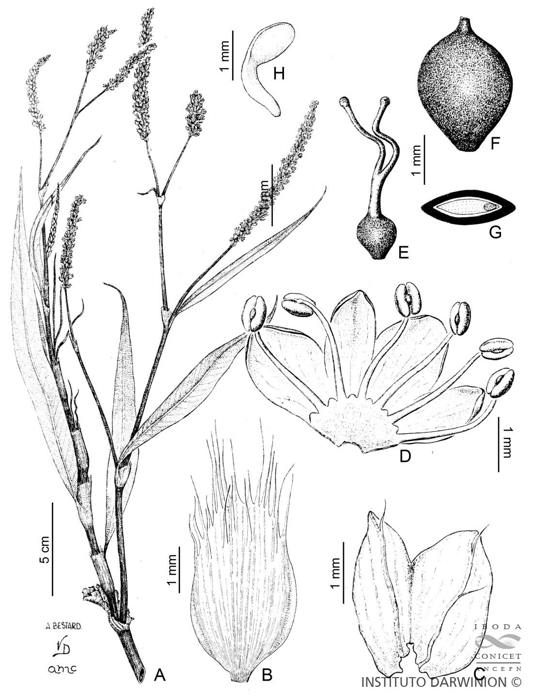 Hierbas perennes, de 0,5-2 m de alto; tallos frecuentemente sumergidos en la base, glabros, estrigosos en la región infranodal. Hojas pecioladas; pecíolos breves (a veces ausentes), de 2-5(-20) mm de largo, articulados a la ócrea, estrigosos; láminas ovado- a lineal-lanceoladas, de 6-23 × 0,8-4 cm, de ápice agudo y base atenuada, a veces levemente cordada, concoloras, epifilo e hipofilo glabros a seríceos, con pelos cortos y rígidos en el borde y sobre el nervio medio en el envés. Ócreas cilíndricas, de 1-4 cm de largo, frecuentemente hendidas sobre la articulación del pecíolo, con cara externa estrigosa a densamente pilosa y borde ciliado. Inflorescencias en cincinos multifloros, de (4-)6-13 flores, formando al agruparse tirsos espiciformes densos, de 3-10 × 0,5-1,5 cm, dispuestos sobre pedúnculos estrigosos de 0,5-5 cm de largo; brácteas infundibuliformes, de 2-5 mm de largo, glabras a estrigosas, de borde ciliado; bractéolas 2-lobadas, de 2-4 mm de largo, frecuentemente con 2 nervios notables, glabras, a veces con pelitos sobre los nervios, de borde escasamente ciliolado; pedicelos de 1-5 mm de largo, glabros. Perigonio blanco, formado por 4 tépalos, 2 internos y 2 externos opuestos, más raramente 5, con prefloración quincuncial, obtusos, de (2-)3-4,5 mm de largo, glabros; androceo compuesto por 6 estambres, con filamentos de 1-5 mm de largo; anteras de 0,5-1 mm de largo; gineceo 2-carpelar, ovario lenticular, biconvexo, de 1 mm de largo, glabro; estilos 2, de 1,5-4 mm de largo, soldados en su base o mitad inferior, glabros, que rematan en estigmas capitados. Aquenios lenticulares, notablemente biconvexos, de 3-4 × 2-2,5 mm, acuminados, con pericarpio de superficie lisa, negro-brillante.
