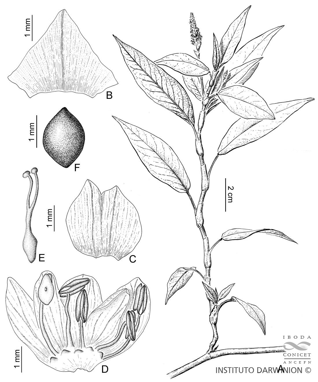 Hierbas perennes, acuáticas o terrestres; tallos glabros o levemente estrigosos, ramificados desde la base, radicantes en los nudos inferiores, flotantes o terrestres. Hojas pecioladas; pecíolos de 1,5-5,5 cm de largo, articulados a la ócrea, pilosos en las hojas superiores y glabros en las inferiores; láminas elípticas, ovadas u oblongas, de 8-13(-20) × (1-)2-4,5 cm, de ápice agudo a obtuso y base truncada, ligeramente cordada, epifilo e hipofilo glabros, a veces pilosos en las hojas apicales, con margen estrigoso o glabro. Ócreas cilíndricas, de 1,5-2,5(-4) cm de largo, con margen truncado, glabras o pilosas en los nudos apicales. Inflorescencia en cincinos paucifloros (2-4 flores), agrupados en tirsos espiciformes densos, cilíndricos y breves, de 1,5-3,5 × ca. 1 cm, con pedúnculos glabros o estrigosos, rara vez ligeramente glandulosos; brácteas de los cincinos infundibuliformes, oblicuas, de 3-3,5 mm de largo, glabras o pilosas en la cara externa; bractéolas irregulares o 2-lobadas, de 2,5-3 mm de largo, glabras; pedicelos de 2-3 mm de largo, levemente aplanados, glabros. Perigonio blanco o rosado, con prefloración quincuncial, compuesto por 5 tépalos obtusos, de 3,5-5 mm de largo, glabros; androceo formado por 5 estambres (raro 4 u 8), exertos o incluidos, con filamentos de 2-4 mm de largo; anteras de 1 mm de largo; gineceo 2-carpelar, ovario lenticular de 1 mm de largo; estilos 2, de 2 mm de largo, soldados en su mitad inferior; estigmas 2, capitados. Aquenios lenticulares, biconvexos, de 2,5 mm de largo, con pericarpio negro-rojizo, de superficie lisa brillante.