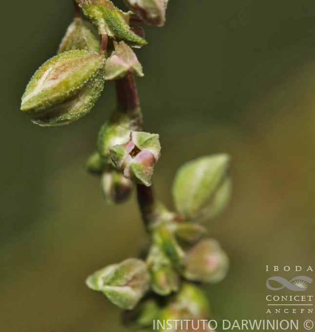 Hierbas anuales; tallos volubles, de 1-1,5 mm de diámetro, glabros. Hojas pecioladas; pecíolos de 0,5-5 cm de largo, glabros, articulados a la ócrea; láminas en general sagitadas o cordadas, de 1,5-6 × 1-3,5 cm, rara vez de base truncada, agudas en el ápice. Ócreas infundibuliformes, de 0,2-0,5 cm de largo, de borde entero, ligeramente irregular, glabras. Inflorescencia en cincinos paucifloros o multifloros (4-8 flores), axilares, solitarios o reunidos en tirsos espiciformes, laxos, de 3-8 cm de largo, con pedúnculos de 1-11 cm de largo, glabros; brácteas de los cincinos basales con lámina sagitada angosta, de 4 × 1,5 mm, pecioladas, con margen generalmente revoluto y ócrea infundibuliforme, de 1-2,5 mm de largo, con borde entero o dentado y un nervio prominente del lado de la articulación del pecíolo de la lámina; brácteas de los cincinos apicales sin lámina, reducidas solamente a la ócrea de la misma; bractéolas cilíndricas, de 1,5-2 mm de largo, de borde irregular, glabras; pedicelos de 1,5-4 mm de largo, glabros. Perigonio blanco-rosado, formado por 5 tépalos, con prefloración quincuncial, obtusos, de 2-2,5 mm de largo, glabros, los 3 más externos papilosos en la cara dorsal; androceo compuesto por 8 estambres, con filamentos algo aplanados, levemente ensanchados en su base, de 0,5-1 mm de largo, soldados entre sí; anteras de 0,5 mm de largo; gineceo 3-carpelar, ovario ovoide-trigono, de 1 mm de largo; estilo brevísimo (0,1-0,5 mm de largo) o ausente; estigmas 3, capitados, apretados entre sí. Aquenios ovoide-trígonos, de 3-4,5 × 2-3 mm, con caras notablemente cóncavas y pericarpio de superficie negro-brillante, finamente granulada.