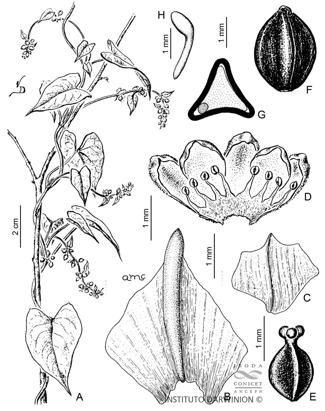 Hierbas anuales; tallos volubles, de 1-1,5 mm de diámetro, glabros. Hojas pecioladas; pecíolos de 0,5-5 cm de largo, glabros, articulados a la ócrea; láminas en general sagitadas o cordadas, de 1,5-6 × 1-3,5 cm, rara vez de base truncada, agudas en el ápice. Ócreas infundibuliformes, de 0,2-0,5 cm de largo, de borde entero, ligeramente irregular, glabras. Inflorescencia en cincinos paucifloros o multifloros (4-8 flores), axilares, solitarios o reunidos en tirsos espiciformes, laxos, de 3-8 cm de largo, con pedúnculos de 1-11 cm de largo, glabros; brácteas de los cincinos basales con lámina sagitada angosta, de 4 × 1,5 mm, pecioladas, con margen generalmente revoluto y ócrea infundibuliforme, de 1-2,5 mm de largo, con borde entero o dentado y un nervio prominente del lado de la articulación del pecíolo de la lámina; brácteas de los cincinos apicales sin lámina, reducidas solamente a la ócrea de la misma; bractéolas cilíndricas, de 1,5-2 mm de largo, de borde irregular, glabras; pedicelos de 1,5-4 mm de largo, glabros. Perigonio blanco-rosado, formado por 5 tépalos, con prefloración quincuncial, obtusos, de 2-2,5 mm de largo, glabros, los 3 más externos papilosos en la cara dorsal; androceo compuesto por 8 estambres, con filamentos algo aplanados, levemente ensanchados en su base, de 0,5-1 mm de largo, soldados entre sí; anteras de 0,5 mm de largo; gineceo 3-carpelar, ovario ovoide-trigono, de 1 mm de largo; estilo brevísimo (0,1-0,5 mm de largo) o ausente; estigmas 3, capitados, apretados entre sí. Aquenios ovoide-trígonos, de 3-4,5 × 2-3 mm, con caras notablemente cóncavas y pericarpio de superficie negro-brillante, finamente granulada.