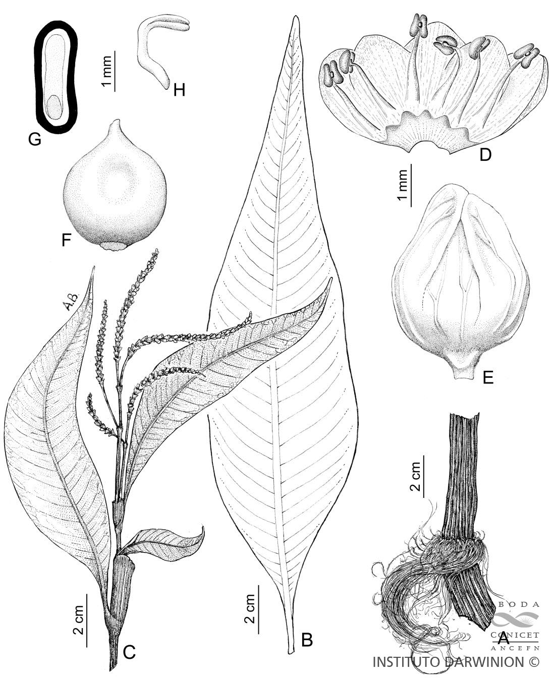 A. Nudo basal. B. Hoja. C. Extremo de una rama florífera. D. Perigonio y androceo. E. Aquenio cubierto por el perigonio. F. Aquenio. G. Corte transversal de aquenio. H. Embrión.
