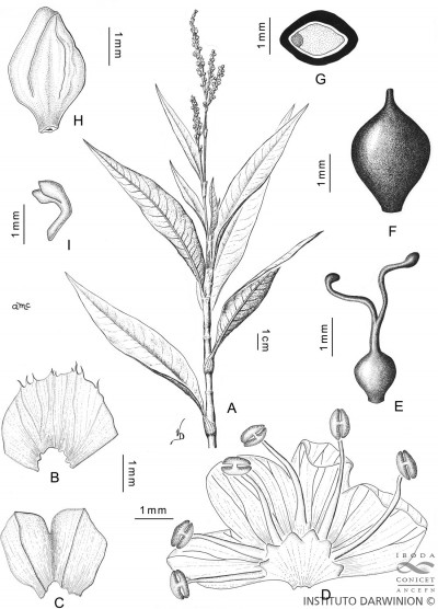 Hierbas perennes; tallos cilíndricos, glabros, frecuentemente glandulosos. Hojas pecioladas; pecíolos breves, hasta de 5 mm de largo, acompañados por la lámina foliar y articulados a la ócrea; láminas lineal-lanceoladas, rara vez anchamente ovadas, de (8-)11,5-14(-18) × 1,5-2,5(-5) cm, de ápice agudo y base atenuada, epifilo e hipofilo glabros, glandulosos, de superficie levemente muricada, margen estrigoso y nervios principales glandulosos, rara vez con escasos pelos cortos y rígidos. Ócreas de 1,4-3(-4) cm de largo, cilíndricas, llegando a veces a cubrir el entrenudo, glabras, ocasionalmente glandulosas, de borde entero, truncado o con escasísimas cilias breves. Inflorescencia en cincinos generalmente paucifloros (4-5 flores), formando al agruparse tirsos espiciformes densos, de 3,5-7 × 1 cm, dispuestos sobre pedúnculos frecuentemente glandulosos, glabros o estrigosos hacia la inflorescencia; brácteas de los cincinos infundibuliforme-truncadas, ligeramente oblicuas, cilíndricas, rara vez en forma de bolsillo, de 3-4 mm de largo, glandulosas en su cara externa, de borde entero, a veces levemente ciliolado; bractéolas de 2-4 mm de largo, 2-lobadas, glabras, eglandulosas; pedicelos de 3-5 mm de largo, glabros. Perigonio compuesto por 4 tépalos, 2 internos y 2 externos, opuestos, raro con 5 tépalos y prefloración quincuncial, obtusos, 3-4,5 mm de largo, a veces glandulosos; androceo compuesto por 6 estambres, filamentos de (1,5-)2,5-3 mm de largo; anteras ca. 1 mm de largo; gineceo 2-carpelar, ovario lenticular de 1 mm de largo; estilos 2, de 2-3 mm de largo, soldados en la base; estigmas 2, capitados. Aquenios lenticulares biconvexos, de 2,5-3 × 1,5-2 mm, con pericarpio de superficie negro-rojiza, lisa o finamente granulada; ocasionalmente gineceo 3-carpelar, que desarrolla en aquenios trígonos, de caras cóncavas.