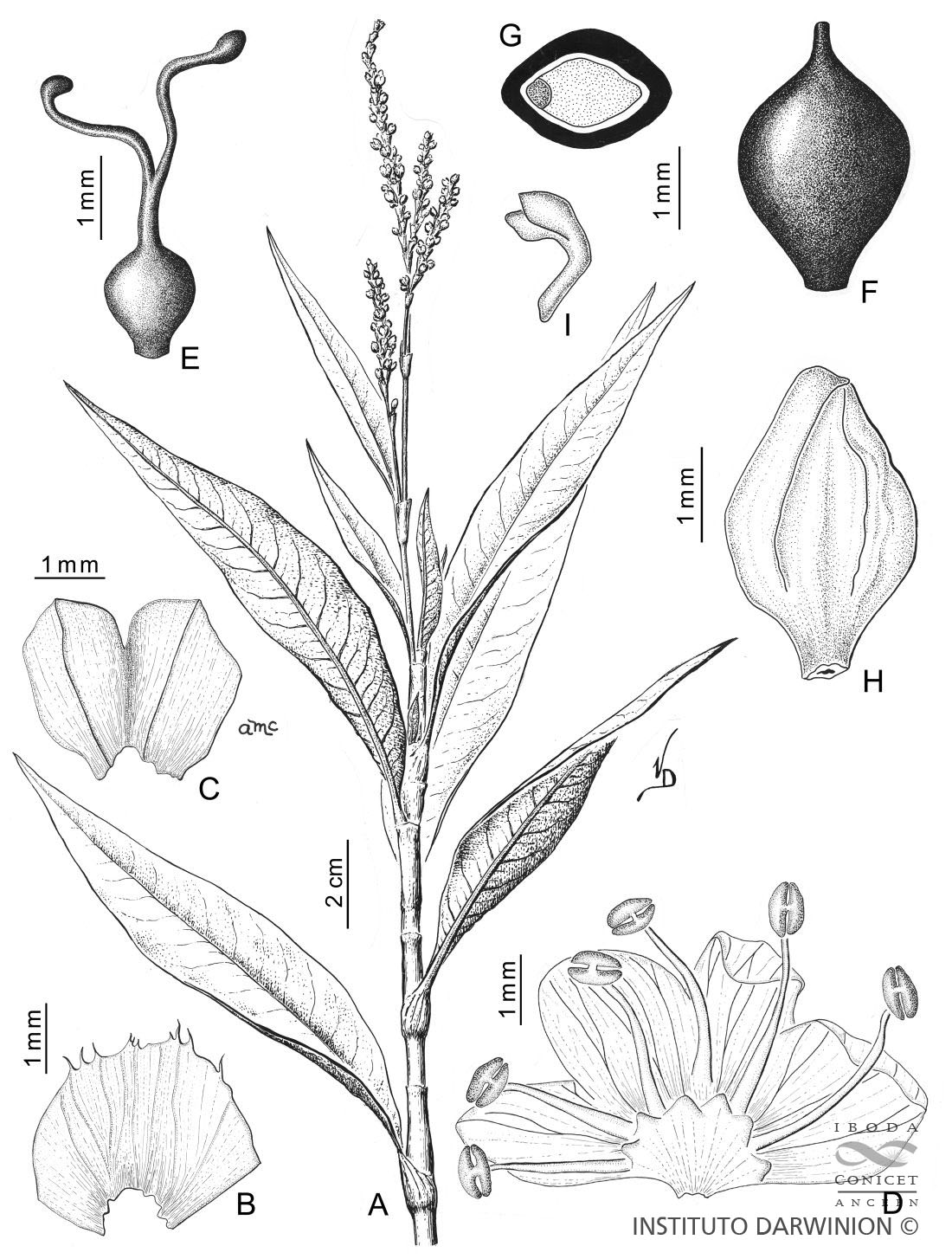 Hierbas perennes; tallos cilíndricos, glabros, frecuentemente glandulosos. Hojas pecioladas; pecíolos breves, hasta de 5 mm de largo, acompañados por la lámina foliar y articulados a la ócrea; láminas lineal-lanceoladas, rara vez anchamente ovadas, de (8-)11,5-14(-18) × 1,5-2,5(-5) cm, de ápice agudo y base atenuada, epifilo e hipofilo glabros, glandulosos, de superficie levemente muricada, margen estrigoso y nervios principales glandulosos, rara vez con escasos pelos cortos y rígidos. Ócreas de 1,4-3(-4) cm de largo, cilíndricas, llegando a veces a cubrir el entrenudo, glabras, ocasionalmente glandulosas, de borde entero, truncado o con escasísimas cilias breves. Inflorescencia en cincinos generalmente paucifloros (4-5 flores), formando al agruparse tirsos espiciformes densos, de 3,5-7 × 1 cm, dispuestos sobre pedúnculos frecuentemente glandulosos, glabros o estrigosos hacia la inflorescencia; brácteas de los cincinos infundibuliforme-truncadas, ligeramente oblicuas, cilíndricas, rara vez en forma de bolsillo, de 3-4 mm de largo, glandulosas en su cara externa, de borde entero, a veces levemente ciliolado; bractéolas de 2-4 mm de largo, 2-lobadas, glabras, eglandulosas; pedicelos de 3-5 mm de largo, glabros. Perigonio compuesto por 4 tépalos, 2 internos y 2 externos, opuestos, raro con 5 tépalos y prefloración quincuncial, obtusos, 3-4,5 mm de largo, a veces glandulosos; androceo compuesto por 6 estambres, filamentos de (1,5-)2,5-3 mm de largo; anteras ca. 1 mm de largo; gineceo 2-carpelar, ovario lenticular de 1 mm de largo; estilos 2, de 2-3 mm de largo, soldados en la base; estigmas 2, capitados. Aquenios lenticulares biconvexos, de 2,5-3 × 1,5-2 mm, con pericarpio de superficie negro-rojiza, lisa o finamente granulada; ocasionalmente gineceo 3-carpelar, que desarrolla en aquenios trígonos, de caras cóncavas.