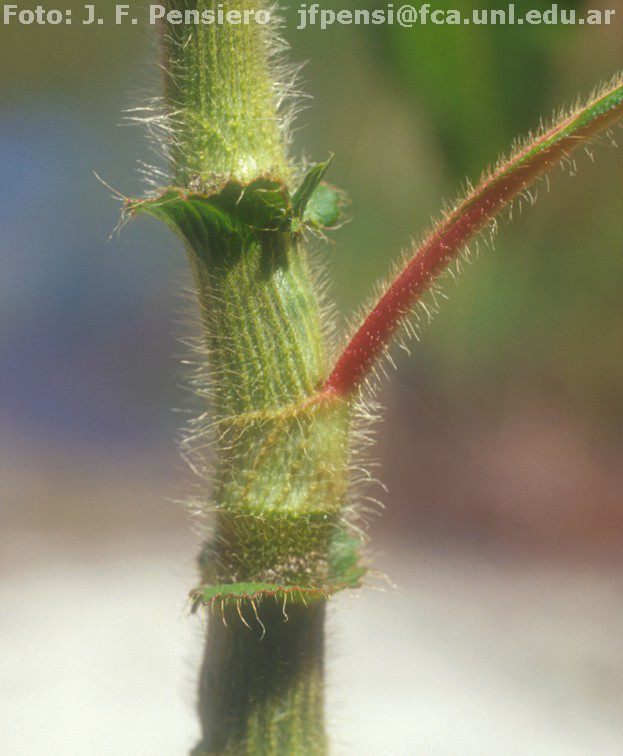 Hierbas perennes, de 0,7-1,5(-3) m de alto; tallos ascendentes o decumbentes y sumergidos en la base, cubiertos por pelos no glandulares, rígidos, adpresos o patentes y pelos glandulares más pequeños. Hojas pecioladas; pecíolos breves, hasta de 1,5 cm de largo, articulados a la ócrea, con pilosidad similar a la del tallo; láminas ovadas, de 4-16(-22) × 1,5-5 cm, de ápice agudo y base obtuso-atenuada, ambas caras con pelos glandulares y no glandulares, más densos y cortos sobre el margen y los nervios principales, y glándulas sésiles que otorgan un aspecto punteado. Ócreas cilíndricas, hasta de 3 cm de largo, cara externa con pelos glandulares y no glandulares, margen membranáceo, ciliolado, verdoso, doblado hacia afuera. Inflorescencia en cincinos paucifloros (4-5 flores), formando al agruparse tirsos espiciformes densos, de 2-6(-10,5) cm de largo, sobre pedúnculos hasta de 5,5 cm de largo, con pubescencia semejante a la del tallo; brácteas de los cincinos infundibuliformes, de 3-5 mm de largo, con escasos pelos glandulares cortos sobre la cara externa y borde ciliolado; bractéolas 2-lobadas, de 2,5-4 mm de largo, con escasos pelos glandulares; pedicelos de 2,5-4 mm de largo. Perigonio banco o rosado, compuesto por 5 tépalos, con prefloración quincuncial, obtusos, de 3-4 mm de largo, con pelos glandulares cortos en su cara externa; androceo formado por 5(6) estambres, con filamentos hasta de 3 mm de largo; anteras ca. 1 mm de largo; gineceo 2-carpelar; ovario lenticular, de 1 mm de largo; estilos 2, de 2-3 mm de largo, que rematan en estigmas capitados. Aquenios lenticulares, de 2,5-3 × 2-2 mm, con caras planas, cóncavas en el centro, con pericarpio de superficie negro-rojiza brillante, finamente granulada.