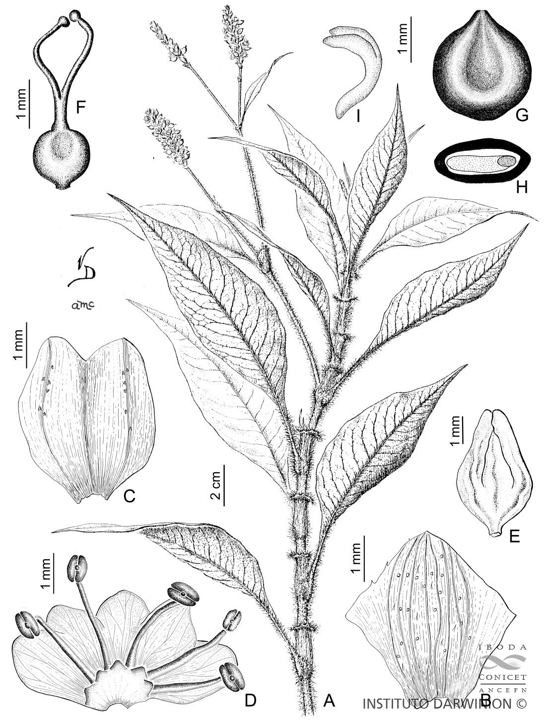 Hierbas perennes, de 0,7-1,5(-3) m de alto; tallos ascendentes o decumbentes y sumergidos en la base, cubiertos por pelos no glandulares, rígidos, adpresos o patentes y pelos glandulares más pequeños. Hojas pecioladas; pecíolos breves, hasta de 1,5 cm de largo, articulados a la ócrea, con pilosidad similar a la del tallo; láminas ovadas, de 4-16(-22) × 1,5-5 cm, de ápice agudo y base obtuso-atenuada, ambas caras con pelos glandulares y no glandulares, más densos y cortos sobre el margen y los nervios principales, y glándulas sésiles que otorgan un aspecto punteado. Ócreas cilíndricas, hasta de 3 cm de largo, cara externa con pelos glandulares y no glandulares, margen membranáceo, ciliolado, verdoso, doblado hacia afuera. Inflorescencia en cincinos paucifloros (4-5 flores), formando al agruparse tirsos espiciformes densos, de 2-6(-10,5) cm de largo, sobre pedúnculos hasta de 5,5 cm de largo, con pubescencia semejante a la del tallo; brácteas de los cincinos infundibuliformes, de 3-5 mm de largo, con escasos pelos glandulares cortos sobre la cara externa y borde ciliolado; bractéolas 2-lobadas, de 2,5-4 mm de largo, con escasos pelos glandulares; pedicelos de 2,5-4 mm de largo. Perigonio banco o rosado, compuesto por 5 tépalos, con prefloración quincuncial, obtusos, de 3-4 mm de largo, con pelos glandulares cortos en su cara externa; androceo formado por 5(6) estambres, con filamentos hasta de 3 mm de largo; anteras ca. 1 mm de largo; gineceo 2-carpelar; ovario lenticular, de 1 mm de largo; estilos 2, de 2-3 mm de largo, que rematan en estigmas capitados. Aquenios lenticulares, de 2,5-3 × 2-2 mm, con caras planas, cóncavas en el centro, con pericarpio de superficie negro-rojiza brillante, finamente granulada.