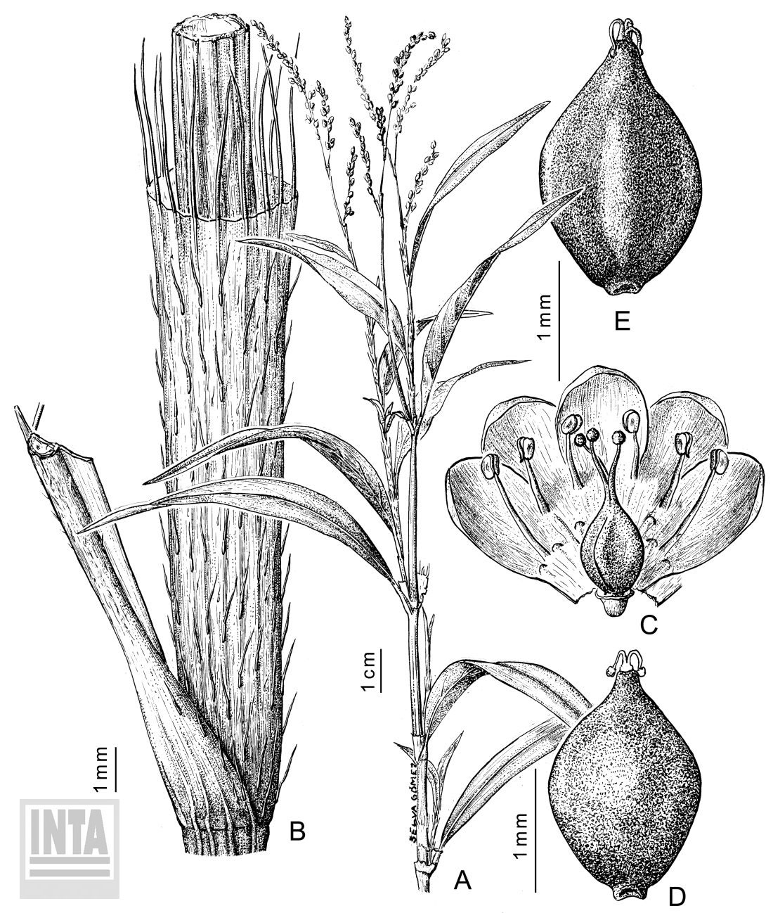 A. Rama florífera. B. Detalle de la ócrea. C. Flor desplegada (gineceo 3-carpelar). D. Aquenio lenticular. E. Aquenio trígono.