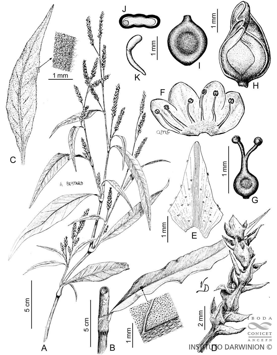 A. Rama florífera. B. Nudo con hoja glabra, con detalle de la superficie glandular. C. Hoja lanosa con detalle de la pubescencia. D. Infrutescencia luego de desprendidos los frutos. E. Bráctea de un cincino desplegada. F. Perigonio desplegado y androceo. G. Gineceo. H. Aquenio cubierto por el perigonio. I. Aquenio. J. Aquenio, corte transversal. K. Embrión.