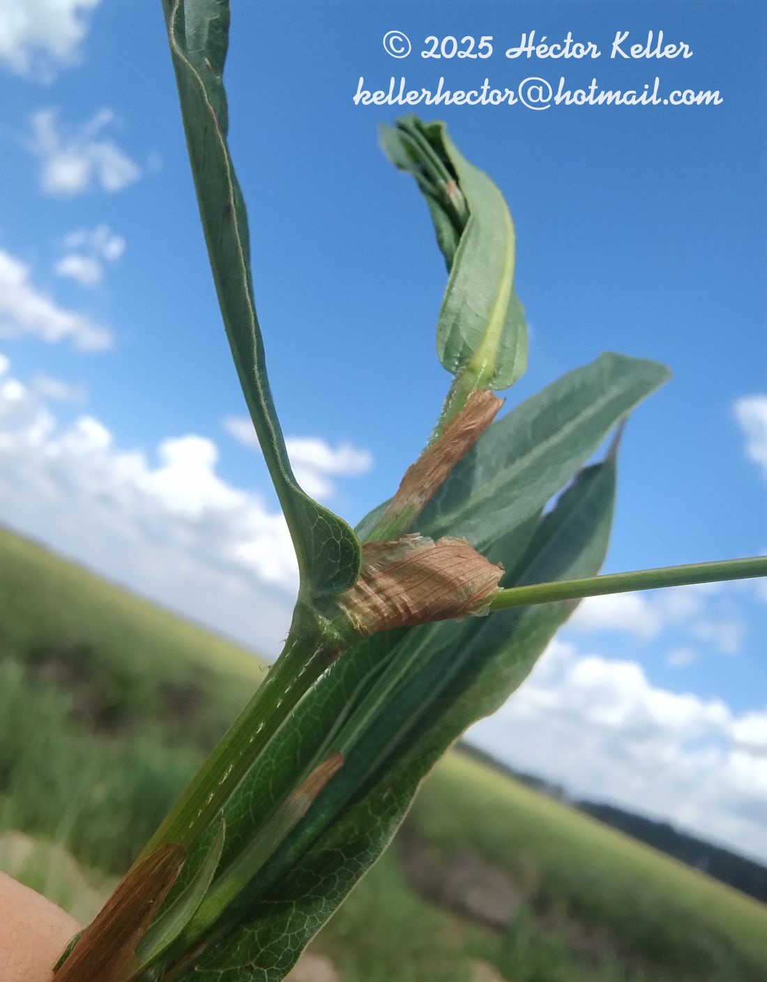 Hierbas perennes, de 0,5-1 m de alto; tallos ascendentes, a veces apoyantes, con raíces adventicias en los nudos basales y pelos rígidos, adpresos o patentes y escasa pubescencia estrellada; hojas pecioladas; pecíolos de 0,1-0,4 cm de largo, rara vez ausentes, híspidos, articulados a la ócrea; láminas lineal-lanceoladas, de 4,5-16 × 0,7-1,5 cm, de base truncada, rara vez cordada o sagitada y ápice atenuado o agudo, híspidas en ambas caras, o solo con pelos rígidos sobre el nervio medio en el envés y pelos densos muy cortos y robustos hacia el margen de la lámina. Ócreas de 0,8-2,5 cm de largo, de borde entero, cara externa híspida y base con hilera de pelos rígidos, notablemente adpresos, de base dilatada. Inflorescencia en cincinos paucifloros (3-4 flores), agrupados en tirsos capituliformes, dispuestos sobre pedúnculos glandulosos; brácteas de los cincinos ovadas, en forma de bolsillo, de 2-4 mm de largo, con borde ciliolado y cara externa estrigosa; bractéolas 2-lobadas, de 2-3 mm de largo, con 2 nervios submarginales notables y pelos escasos en el extremo de la cara externa; pedicelos de 1,5-3 mm de largo, a veces glandulosos. Perigonio blanco o rosado, compuesto por 4-5 tépalos, 2 internos y 2 externos opuestos, o con prefloración quincuncial, obtusos, de 2-3 mm de largo, glabros; androceo formado por 5-6 estambres, con filamentos levemente aplanados, de 1,5-2,2 mm de largo, ensanchándose hacia la base; anteras de 0,3-0,5 mm de largo; gineceo 3-carpelar, ovario ovoide-trígono, de 1 mm de largo; estilos 2, de 0,5-1 mm de largo; estigmas capitados. Aquenios ovoide-trígonos, de 2-3 × 1,5-2 mm, de caras convexas y pericarpio de superficie lisa castaña.