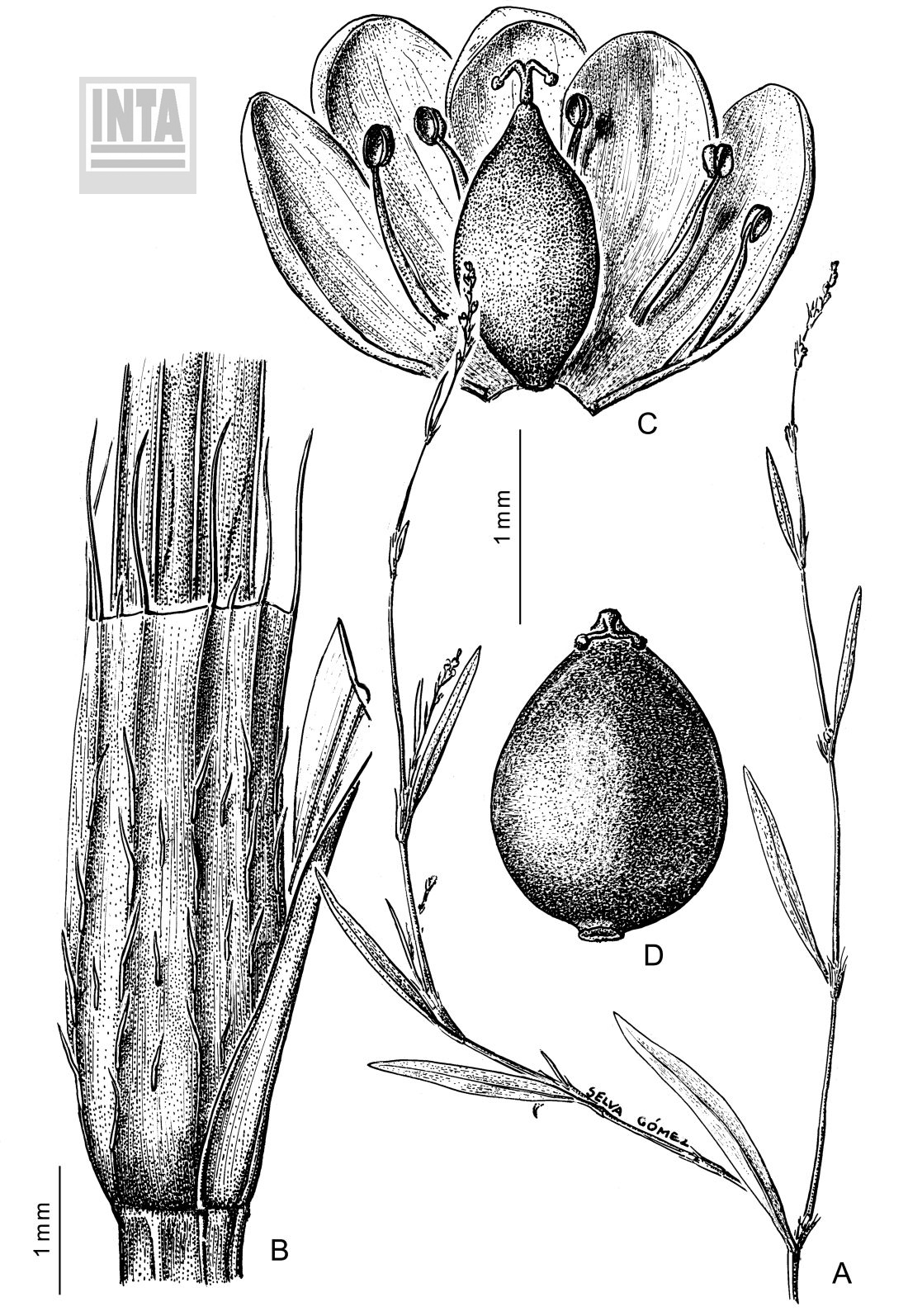 Hierbas anuales, hasta de 20(-30) cm de alto; tallos delgados y gráciles, glabros; hojas subsésiles, pequeñas, ovado-lanceoladas, de 2-4 × 0,5 cm, glabras o ligeramente pubescentes en el envés, con margen y nervios principales estrigosos. Ócreas cilíndricas, de 3-5 mm de largo, con cara externa ligeramente pilosa y margen ciliado. Inflorescencia en cincinos paucifloros (3-4 flores), reunidos en tirsos espiciformes de 1,5-3 cm de largo, hallándose los cincinos inferiores aislados entre sí; brácteas de los cincinos infundibuliformes, de 2 mm de largo, glabras y con borde ciliolado; bractéolas 2-lobadas, de 2 mm de largo; pedicelos hasta de 2 mm de largo, glabros. Perigonio compuesto por 5 tépalos con prefloración quincuncial, obtusos, de 2 mm de largo, glabros; androceo formado por 8 estambres dispuestos en 2 ciclos (5 + 3), filamentos ca. 0,5 mm de largo, levemente ensanchados en la base; anteras muy pequeñas, (ca. 0,5 mm de largo); gineceo 2-3 carpelar, ovario lenticular u ovoide-trígono, ca. 1 mm de largo; estilos 2 ó 3, soldados brevemente en su base; estigmas 2 ó 3, capitados. Aquenios lenticulares plano-convexos o trígonos, de caras cóncavas, de 2 × 1,5 mm, con pericarpio de superficie lisa, brillante.