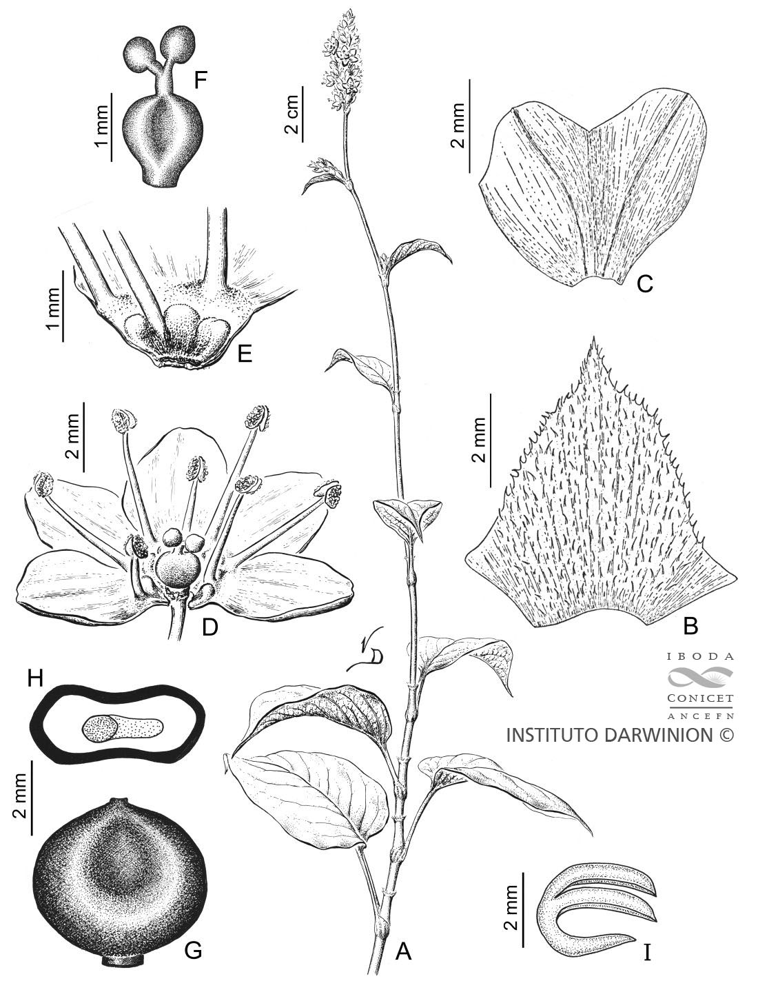 Hierbas anuales, hasta de 2,5 m de alto; tallos ascendentes, pilosos. Hojas pecioladas; pecíolos de 1-7 cm de largo, pilosos, parcialmente acompañados por la lámina foliar, articulados a la ócrea; láminas anchamente ovadas, de (3-)8,5-17 × (1,5-)3,5-9 cm, de ápice obtuso a agudo, base obtuso-atenuada, ambas caras escasamente pilosas, con margen y nervios principales estrigosos. Ócreas infundibuliforme-oblicuas, de 0,5-1 cm de largo, de borde ciliolado (rara vez dilatado ondulado), con cara externa pilosa o glabra. Inflorescencia en cincinos multifloros (6-11 flores), formando al reunirse tirsos espiciformes densos, más o menos péndulos, de 2,5-9 cm de largo, dispuestos sobre pedúnculos de 4-7 cm de largo, pilosos; brácteas infundibuliformes, de 4-5 mm de largo, de cara externa estrigosa y borde ciliolado; bractéolas 2-lobadas, de 3,5-4 mm de largo, 2-nervadas, glabras; pedicelos de 4-6 mm de largo, glabros. Perigonio rosado intenso a violeta, formando por 5 tépalos con prefloración quincuncial, obtusos, de 4-5 mm de largo, con nerviación conspicua, glabros; androceo compuesto por 6-7 estambres, con filamentos de 3,5-5 mm de largo; anteras de 1 mm de largo, color amarillo intenso; gineceo 2-carpelar, ovario lenticular, de 1 mm de largo, de caras biconvexas, con zona central cóncava; estilos 2, de 0,5-1 mm de largo, soldados en la base, que rematan en estigmas conspicuamente capitados. Aquenios lenticulares, biconvexos, con zona central cóncava, de 3 × 2,5-4 mm, con pericarpio de superficie negra, finamente granulada.