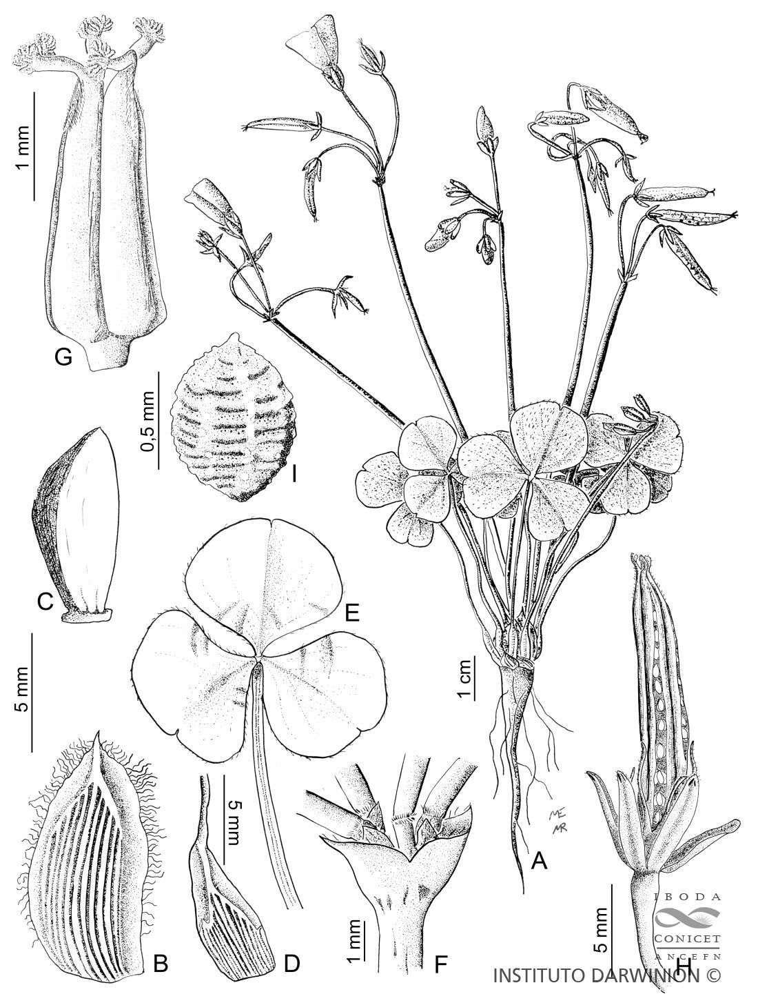 Hierbas acaules, bulbosas, hasta de 30 cm de alto. Raíces axonomorfas, napiformes, carnosas, comestibles; bulbos escamosos, simples, con frecuencia con bulbillos en la base, formados por escamas protectoras ovadas, plurinervias, membranáceas y escamas nutricias interiores ovadas, carnosas. Hojas numerosas; estípulas adnatas al pecíolo, coriáceas y membranáceas en el margen; pecíolos de 4-15 cm de largo, glabros; foliolos 3, obcordados a suborbiculares, apenas emarginados, incisos 1/3-1/5, glabros o con escasos pelos en la haz y abundantes en el envés, margen pubescente, superficie celulósica no observada, lóbulos redondeados; calli no observados. Cimas (1-)paucifloras, hasta 3 veces mayores que el follaje; pedúnculos con la base ensanchada y la parte aérea cilíndrica y glabra; brácteas soldadas entre sí, ciliadas, glandulosas; bractéolas opuestas, ovadas, ciliadas, con pelos en la cara abaxial; pedicelos con escasos pelos. Flores hasta de 30 mm de diámetro; sépalos ovados; calli presentes; pétalos 2-3 veces el largo de los sépalos, purpúreos. Cápsulas cilíndricas, glabrescentes, con pelos cortos en la cara interna. Semillas numerosas, ovoides, estriadas, con surcos transversales bien marcados.