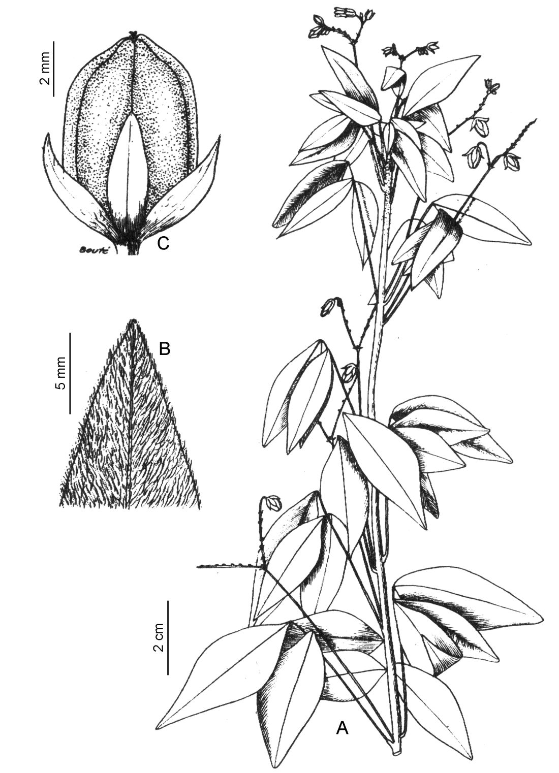 A. Rama. B. Detalle del ápice del folíolo. C. Cápsula. Tomado de Bradea 7(1): 53, fig. 9. 1994.
