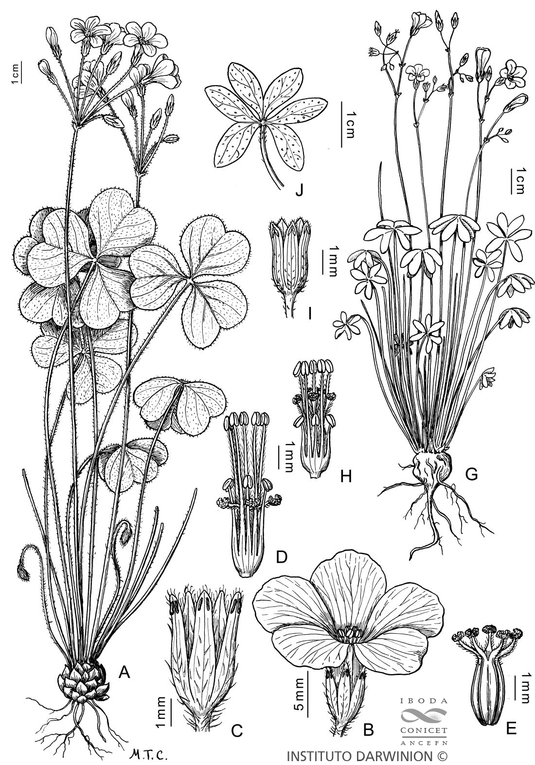 Hierbas perennes, bulbosas, acaules, de 10-30 cm de alto. Raíces napiformes, con ramificaciones fibrosas; con numerosos bulbillos cónicos, sésiles, que se desarrollan tempranamente; brácteas protectoras y brácteas nutricias presentes. Hojas numerosas, pseudoverticiladas; estípulas membranáceas, ciliadas, 3-nervias; pecíolos de 8-18 cm de largo, pubescentes, con pelos largos, visibles a simple vista; folíolos 3, obcordados, retusos, hasta de 50 × 50 mm, incisos 1/6-1/8, lóbulos redondeados, glabros o con pelos largos, esparcidos irregularmente o más abundantes hacia los márgenes; calli anaranjados o violáceos dispuestos en los márgenes. Cimas umbeliformes, subumbeliformes o asimétricamente bífidas, laxifloras, 3-15-floras; pedúnculos un poco menores o hasta del doble de la altura del follaje, glabros o poco pubescentes; brácteas opuestas, hialinas, anchamente ovadas o romboidales; pedicelos articulados cerca de la base; bractéolas pubescentes, a veces con calli. Flores hasta de 15-20 mm de diámetro; sépalos lineares a elípticos, con el ápice ciliado, con calli; pétalos 2-3 veces el largo de los sépalos, rosados. Cápsulas cilíndricas, glabras. Semillas ovoideo-aplanadas.