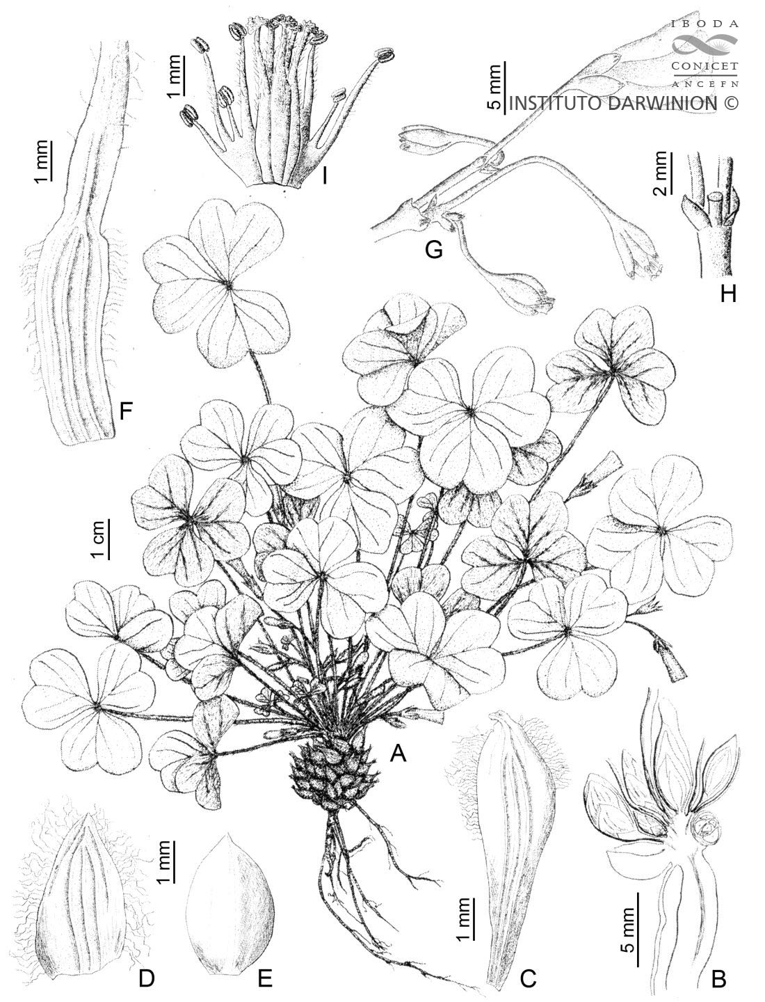 Hierbas perennes, bulbosas, acaules, de 10-30 cm de alto. Raíces napiformes, con ramificaciones fibrosas; con numerosos bulbillos cónicos, sésiles, que se desarrollan tempranamente; brácteas protectoras y brácteas nutricias presentes. Hojas numerosas, pseudoverticiladas; estípulas membranáceas, ciliadas, 3-nervias; pecíolos de 8-18 cm de largo, pubescentes, con pelos largos, visibles a simple vista; folíolos 3, obcordados, retusos, hasta de 50 × 50 mm, incisos 1/6-1/8, lóbulos redondeados, glabros o con pelos largos, esparcidos irregularmente o más abundantes hacia los márgenes; calli anaranjados o violáceos dispuestos en los márgenes. Cimas umbeliformes, subumbeliformes o asimétricamente bífidas, laxifloras, 3-15-floras; pedúnculos un poco menores o hasta del doble de la altura del follaje, glabros o poco pubescentes; brácteas opuestas, hialinas, anchamente ovadas o romboidales; pedicelos articulados cerca de la base; bractéolas pubescentes, a veces con calli. Flores hasta de 15-20 mm de diámetro; sépalos lineares a elípticos, con el ápice ciliado, con calli; pétalos 2-3 veces el largo de los sépalos, rosados. Cápsulas cilíndricas, glabras. Semillas ovoideo-aplanadas.