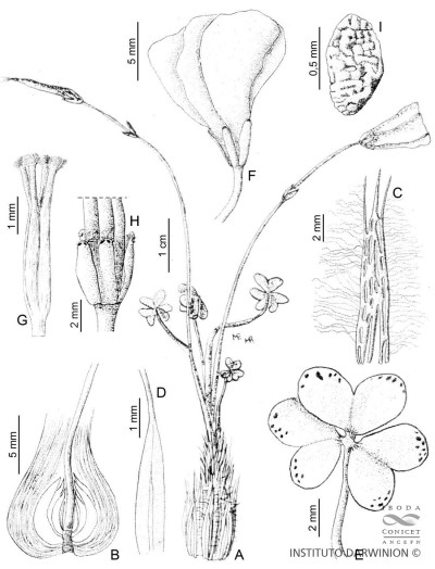 Hierbas acaules, perennes, pequeñas, de 4,5-8 cm de alto. Bulbos cónicos, de 6-15 × 6-15 mm; escamas protectoras linear-Ianceoladas, de 6-15 mm de largo, fibrosas, con pelos lanosos en los bordes; escamas nutricias ovales, de 10 mm de largo, blancas, carnosas, glabras. Hojas escasas, 3-6; estipulas adnatas, de 9-40 mm de largo, blancas, glabras; peciolos cilíndricos, de 7-30 mm de largo, glabros o apenas pubescentes; foliolos 3, obcordados, de 2-5 × 3-5 mm, glabros, incisos 1/3-1/2, con lóbulos divergentes; calli no observado. Cimas 1-floras; sobrapasando1-2 veces el follaje; pedúnculos con base membranácea, blanca, glabra y parte aérea cilíndrica, glabra; brácteas 2, lineares, de 2,5-4 mm de largo, soldadas en la base, glabras; pedicelos de 10-32 mm de largo, glabros. Flores hasta de 60 mm de diámetro; sépalos oblongos, de 3-4 × 1 mm, obtusos, ciliados, con calli; pétalos espatulados, rosados a violáceos, glabros; pedúnculo y pedicelo fructífero erguidos. Cápsulas cilíndricas, con pubescencia corta y escasa. Semillas ovoides, castañas, notablemente rugosas.