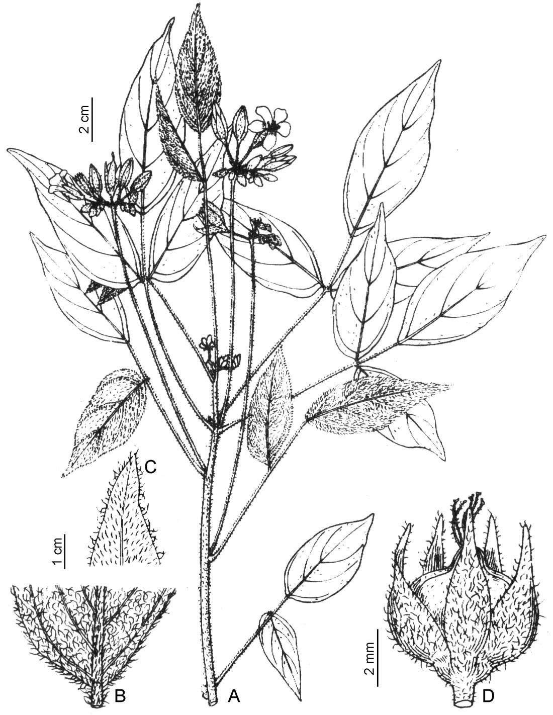 A. Rama. B. Base del folíolo. C. Ápice del folíolo. D. Cápsula. Tomado de Bradea 7(1): 127, fig. 32. 1994.