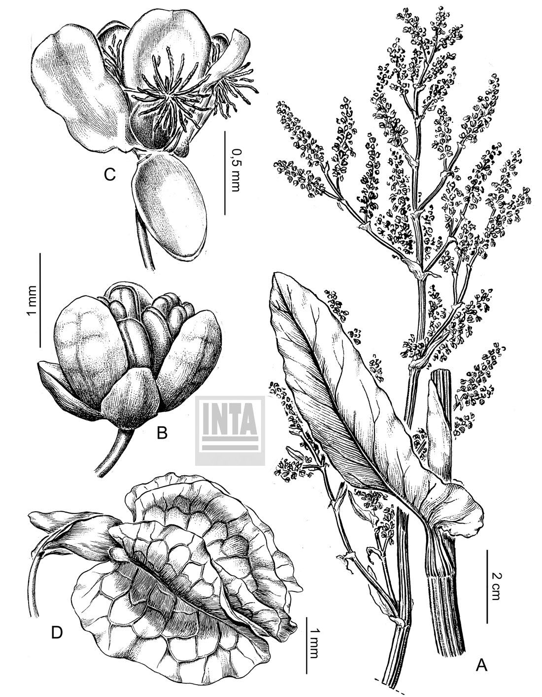 Plantas dioicas, perennes, de alrededor de 1 m de alto; tallos erguidos, simples o ramificados, papilosos y pubescentes. Hojas pecioladas, subsésiles hacia el ápice; pecíolos hasta de 20 cm de largo, glabros o pubescentes, a veces papilosos; láminas sagitadas, de 3,5-22 × 1-8 cm, glabras a pubescentes y papilosas, a veces sólo en la base y nervios. Ócreas algo papilosas, glabras o pubescentes, con borde oblicuo, laciniado. Inflorescencias amplias, ebracteadas; pedicelos hasta de 3 mm de largo. Perigonio de las flores estaminadas con tépalos hasta de 1,8 mm de largo, los externos algo menores y más angostos que los internos; estambres con filamentos ca. 0,5 mm de largo; anteras de 0,8-1,5 mm de largo. Perigonio de las flores pistiladas con tépalos hasta de 1,5 mm de largo; tépalos externos ovados, reflexos a la madurez del fruto; tépalos internos anchamente ovados; ovario ca. 0,5 mm de largo; estigmas penicilados. Valvas fructíferas cordiformes o deltoides, hasta de 4 × 4,5 mm, reticuladas, de borde entero, con pequeño callo basal ovoide, de superficie rugosa. Aquenios elipsoideo-trígonos, de 1,8-2,2 × ca. 1,2 mm, castaños, lisos, brillantes.