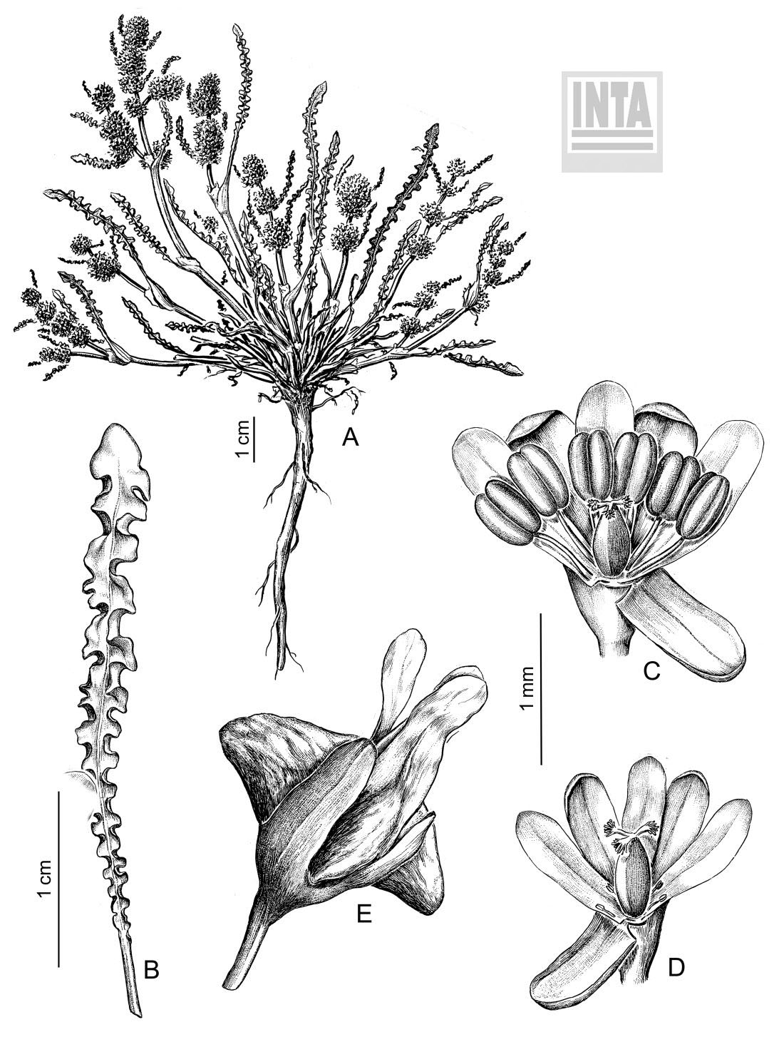 Plantas ginomonoicas, perennes, de 5-30 cm de alto; tallos decumbentes o ascendentes, ramificados. Hojas pecioladas; pecíolos de 0,5-2,5 cm de largo; láminas angostamente lanceoladas u oblanceoladas, de 1-14 × 0,3-1,5 cm, obtusas, de base cuneada, con borde sumamente ondeado, ligeramente carnosas o coriáceas. Ócreas de borde irregular, glabras. Inflorescencias generalmente extendidas en la base y densas hacia el ápice, bracteadas; pedicelos iguales o menores que las flores. Perigonio de las flores pistiladas y perfectas con tépalos externos de 0,5-1,2 mm de largo, angostamente oblongos; tépalos internos de 1-2 mm de largo, de forma similar; estambres con filamentos de 0,5-1 mm de largo; anteras de 0,3-0,5 mm de largo; ovario de 0,5-0,8 mm de largo; estigmas penicilados. Valvas fructíferas de contorno oblongo, hasta de 2,5 mm de largo, de borde entero, con callo cónico, de superficie rugosa, generalmente desarrollado en las 3, rara vez sólo en 1 ó 2 valvas. Aquenios elipsoideo-trígonos u ovoideo-trígonos, de 1,2-2 × 0,5-1 mm, castaños, lisos, brillantes.