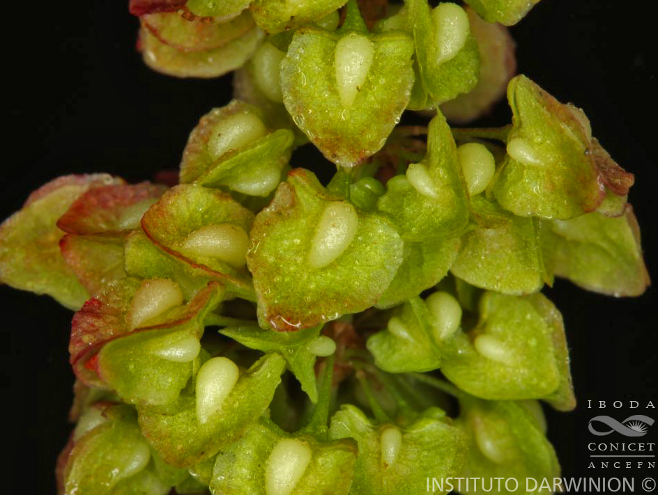 Plantas polígamas, perennes, de 0,5-1 m de alto; tallos erguidos generalmente simples, rara vez ramificados. Hojas pecioladas; pecíolos de 1-30 cm de largo; láminas oblongas, de 2,5-20 × 0,5-6,5 cm, de base cuneada o truncada y ápice agudo, con borde ondeado. Ócreas escariosas, en general quebradizas. Inflorescencias densas, bracteadas en los nudos basales, luego ebracteadas; pedicelos de 2-8 mm de largo. Perigonio con tépalos externos lineares, obovados u oblongos, de 0,5-1,5 mm de largo; tépalos internos elípticos, de 1,5-2,5 mm de largo; estambres con filamentos hasta de 1,8 mm de largo; anteras de 0,8-1,5 mm de largo; ovario de 0,5-1 mm de largo; estigmas penicilados. Valvas fructíferas anchamente cordiformes, de 4,5-5 × 2,5-6 mm, reticuladas, las 3 con callo conspicuo, ovoide, de superficie reticulado-foveolada, a veces una de las valvas de mayor tamaño y con callo más desarrollado que los otros 2. Aquenios anchamente fusiforme-trígonos, de 1,5-3 mm de largo, castaños, lisos.