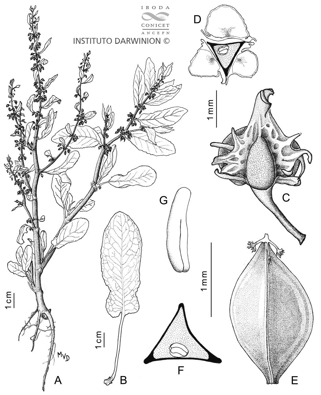A. Planta en flor. B. Hoja. C-D. Fruto cubierto por los tépalos internos (valvas fructíferas), vista lateral y corte transversal, respectivamente. E-F. Aquenio, vista lateral y corte transversal, respectivamente. G. Embrión.