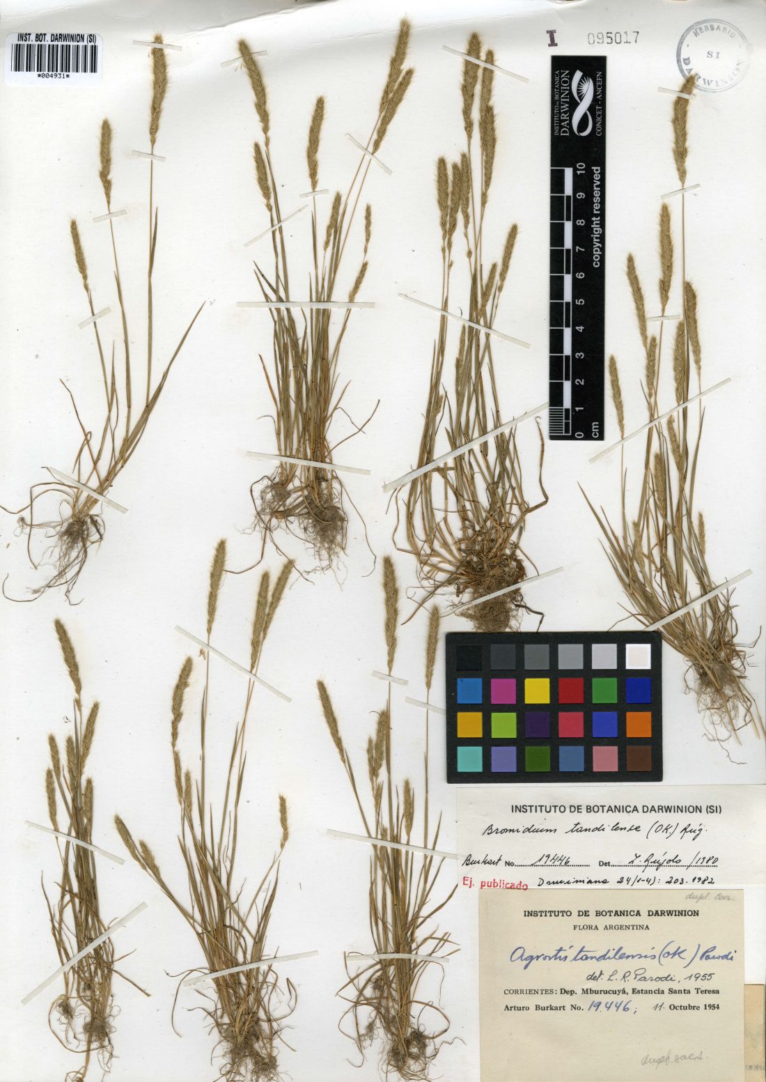 Planta anual, cespitosa; cañas erectas, delgadas, 5-50 cm de alto; vainas estriadas, glabras; lígulas membranáceas, 1,5-3 mm de largo, borde denticulado; láminas planas, 2-10 x 0,1-0,4 cm. Inflorescencia una panoja densa, cilíndrica, pajiza, verdosa o castaña, 0,9-8 cm x (0,2-)0,7-1,5 cm, multiespiculada; ramas laterales adpresas hasta de 1 cm de largo, ramificaciones y pedicelos escabriúsculos. Espiguillas de 2,6-3,6 mm de largo; glumas 2, subiguales, 1-nervias; la inferior brevemente mayor, 2,6-3,6 mm de largo; la superior (2-)2,4-3,5 mm de largo; carina escabrosa, dorso glabro; antecio caedizo; lemma pilosa, (1-)1,4-1,6 mm de largo, 5-nervio, nervios laterales proyectados en arístulas, los marginales (0,8-)1-2 mm de largo, los internos 0,1-0,2(-0,5) mm de largo, nervio medio prolongado en arista de 4,5-6 mm de largo, retorcida en la base, geniculada, mayor que las glumas; pálea ausente; callo piloso. Flor hermafrodita, generalmente cleistógama; lodículas 2, membranáceas, enervias; estambres 3, anteras de 0,2-0,5 mm de largo; ovario con dos estilos y estigmas plumosos; cariopsis de 1-1,3 mm de largo, fusiforme, libre o adherida a la lemma, frecuentemente con las anteras adheridas al estigma; embrión pequeño; endosperma líquido o pastoso; hilo oval, estrecho.