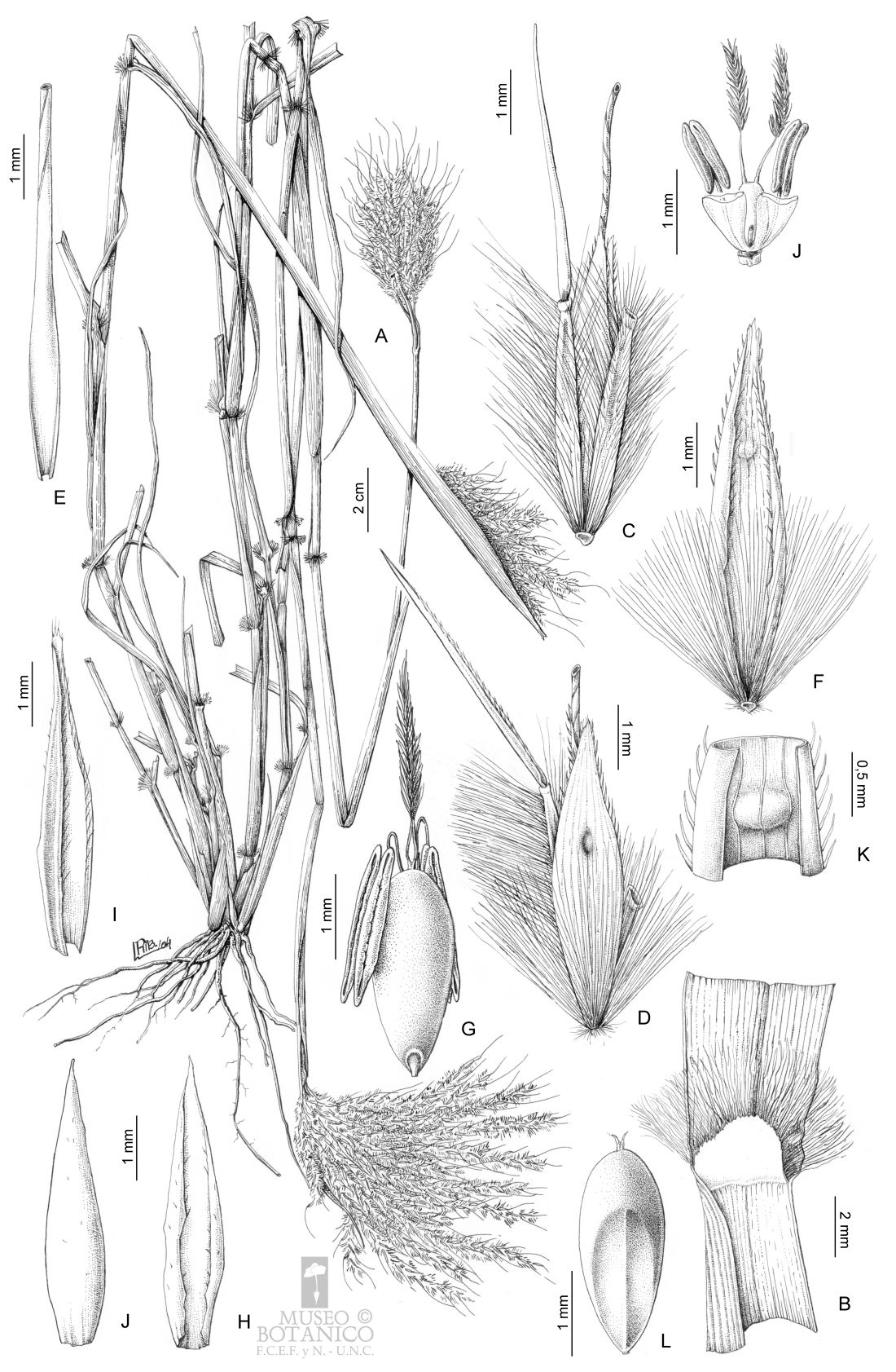 A. Planta. B. Región ligular. C, D. Par de espiguillas vista ventral y dorsal respectivamente. E. Base de la arista. F. Gluma inferior vista interna. G. Cariopsis madura con resto de estilos y anteras en el ápice, vista hilar. H, J. Lemma inferior vista externa e interna. I. Gluma superior. K. Protuberancia producida por la fóveola, detalle de F. L. Cariopsis, vista escutelar. M. Flor con lodículas (el estambre frontal seccionado).