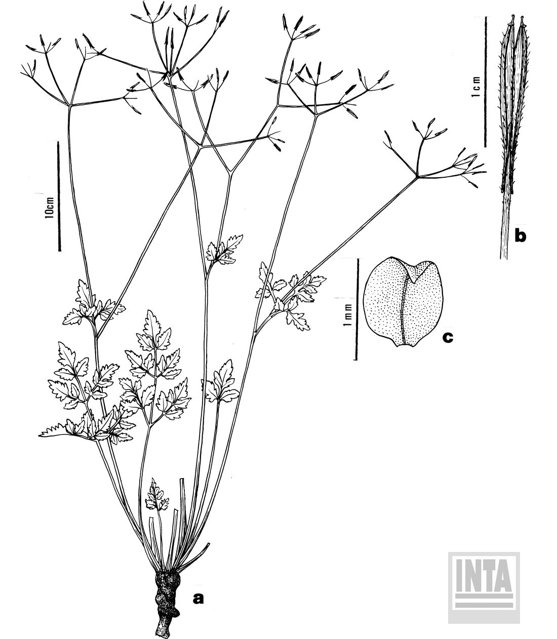 Plantas gráciles, de 15-70 cm de alto, hirsútulas hasta glabras. Hojas 2-ternadas o ternado pinnadas, ± orbiculares, de 4-10 cm de diámetro, escasamente pilosas sobre los nervios y raquis, últimos segmentos peciolulados, ovados, de 1,5-5 × 1-3 cm, groseramente serrados en el medio distal, más o menos pinnatipartidos hacia abajo. Umbelas 1 a 3, involucro e involucelos ausentes, radios 2 a 6, de 2-9 cm de largo, fuertemente divergentes hasta reflejos. Flores blanco-verdosas, estilos ca. 0,3 mm de largo. Frutos claviformes de 10-16 mm de largo, ápice obtuso, agudo o constricto, base caudada, costillas densa a moderadamente híspidas principalmente en la base, apéndices de 3-9 mm de largo.