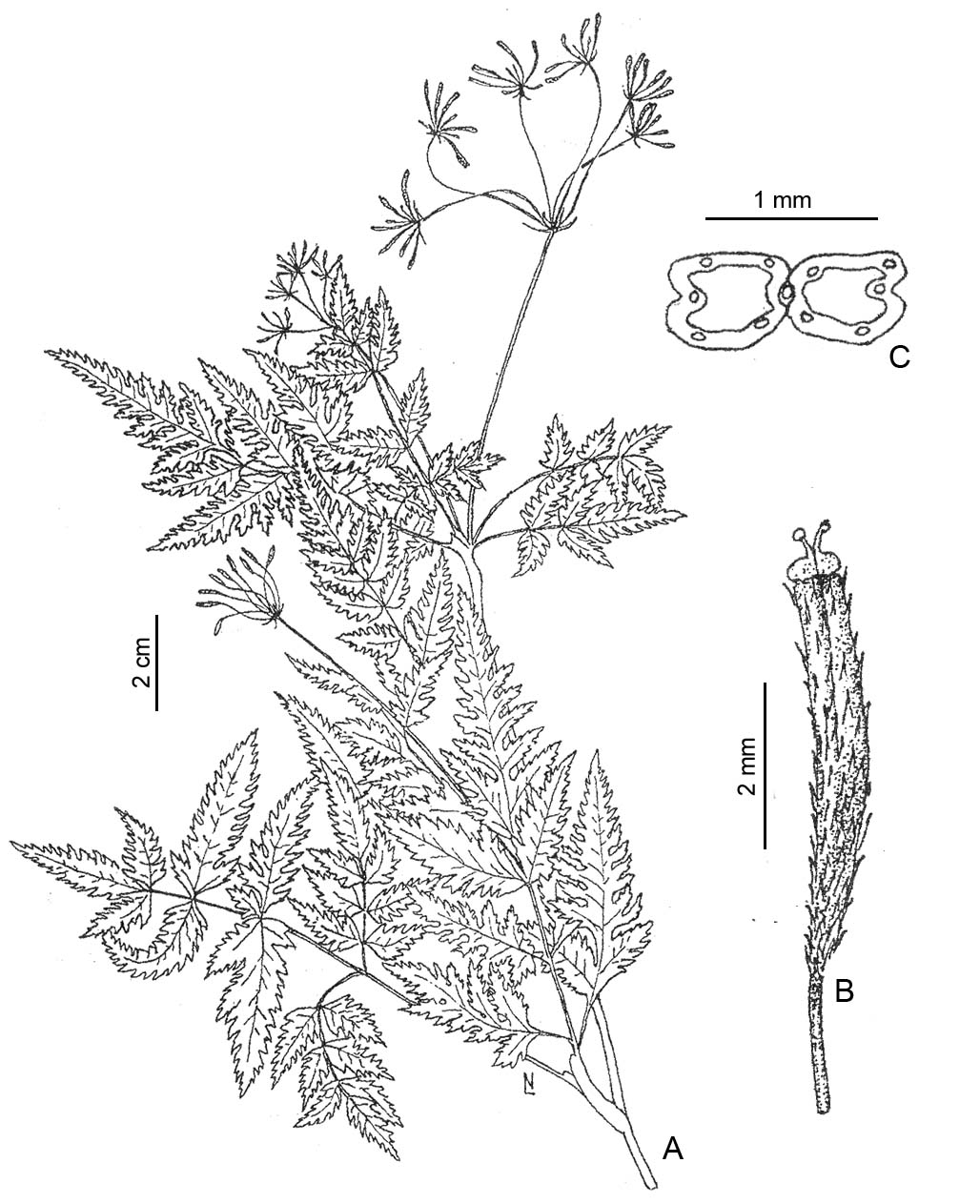 Plantas gráciles hasta algo robustas, de 40-100 cm de alto, tallos hirsútulos. Hojas 2-3 ternadas, deltoides a anchamente ovadas, de 5-15 cm de largo, vellosas o pilosas particularmente en el envés, segmentos ovados de 2-4 × 1,5-3 cm, groseramente serrados a variablemente incisos. Umbelas 2 a 4, sin involucro o con 1 o 2 brácteas lineales hasta de 10 mm de largo, radios 2 a 5, de 2-11 cm de largo, extendidos, ascendentes, involucelos de 2-4 bractéolas lineares, acuminadas, ciliadas, de 2,5-9,5 mm de largo. Flores blanco-verdosas, estilos de 0,6-1 mm de largo. Fruto linear-oblongo, de 10-20 mm de largo, angostándose hacia el ápice en un rostro corto, base caudada, costillas densa a moderadamente híspidas al menos hacia la base, apéndices de 2-7 mm de largo.