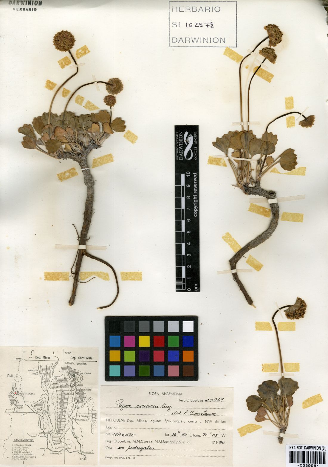 Observaciones: Varias colecciones de individuos que crecen en Neuquén presentan caracteres reproductivos típicos de P. coriacea, con hojas características de P. volcanica, dificultando la delimitación de las especies, tal como lo plantearon Mathias & Constance (1962).
