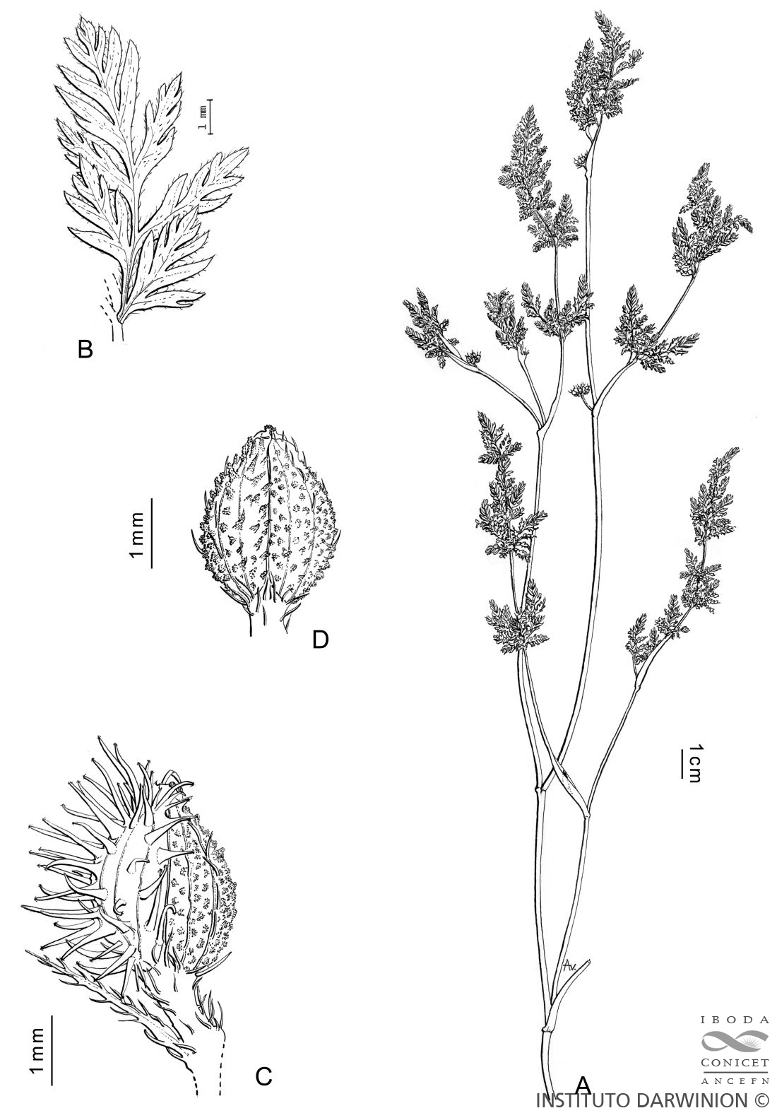 Hierbas anuales de 10-60 cm de alto, decumbentes; tallos híspidos. Hojas basales 2-3 pinnatisectas; lámina obloga de 6-12 × 2-4 cm, con 7-11 pinnas primarias ovadas de 1-3 cm de largo, incisas a pinnatifidas, últimos segmentos agudos; hojas caulinares semejantes, menores, menos divididas. Umbelas capitadas, opuestas a las hojas, las inferiores cortamente pedunculadas, las distales sésiles; radios 2-3 muy breves u obsoletos, involucro ausente; umbélulas paucifloras, pedicelos breves u obsoletos, involucelo de 6-8 bractéolas linear-subuladas, híspidas. Flores blancas. Frutos ovoideos, de 2,5-4,5 × 2 mm, los interiores de la umbela cubiertos de tubérculos o papilas, los exteriores equinados con espinas gloquidiadas, al menos en su mericarpio externo.