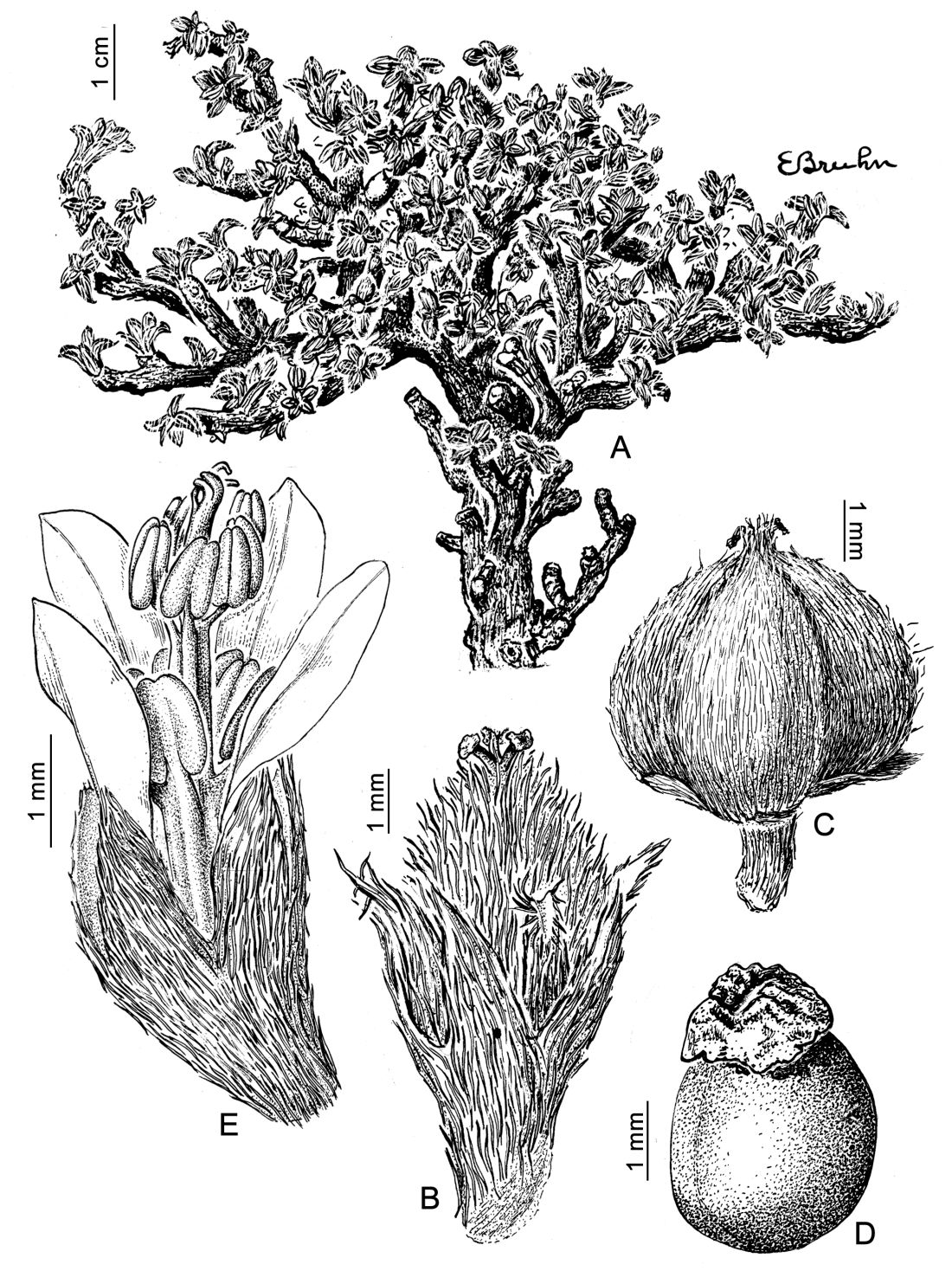 Subarbustos perennes, de 5-25 cm de alto, dioicos, muy ramosos, achaparrados, en cojín denso; tallo y ramas muy leñosas, erectas; entrenudos de 0,3-0,5 mm de largo. Hojas sésiles; láminas elípticas, ovadas o triangulares, de 5-7 × 1,5-2,5 mm, agudas, margen entero, con una glandulita en el ápice, acartuchadas, rígidas, densamente cubiertas de tricomas malpighiáceos blanquecinos o grisáceos en ambas caras. Flores estaminadas en inflorescencias de 1(-2-5) flores de 1,5-2 mm de largo, pedicelo de 0,5-1 mm de largo; sépalos (3-)5, lanceolados, de 2-3 × 0,5-1,2 mm, márgenes enteros, densamente cubiertos de tricomas malpighiáceos en la cara dorsal y glabros en la cara ventral; pétalos 5, lanceolados o oblanceolados, de 2,5-4 × 0,5-1 mm, libres, glabros, amarillos; estambres 10 (5+5), formando una columna ca. 1,2 mm de largo; estaminodios 3, ca. 0,5 mm de largo, glabros en el ápice; disco nectarífero compuesto por 5 glándulas en la base de la columna, alternando con los pétalos. Flores pistiladas solitarias; pedicelo ca. 2 mm de largo; sépalos aciculares o triangulares, de 1-2,5 × 0,3-1 mm, connados en la base, agudos, densamente cubiertos de tricomas malpighiáceos en la cara dorsal, la ventral glabra; pétalos 5, de 2-3,5 × 0,2-1 mm, densamente cubiertos de tricomas malpighiáceos en su cara dorsal y glabros en la ventral, amarillos; disco nectarífero compuesto por 5 glándulas, opositisépalos, insertas en el disco, glabros; estilos 3, ca. 1,1 mm de largo, 2-fidos en el tercio superior, estigmas teretes. Fruto una cápsula de 4-6 mm de largo, densamente cubierto de tricomas malpighiáceos.