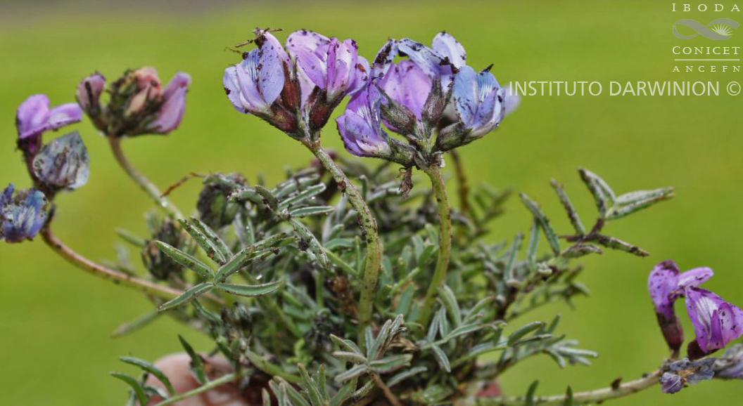 Hierba perenne, cespitosa. Tallos de 4-36 cm, seríceos cuando jóvenes, luego glabres¬centes. Hojas de 2,5-6 cm, erectas, 7-12-yugadas con impar; estípulas de 2-4 mm, ample¬xicaules, membranáceo-hialinas, bidentadas, pubérulas; folíolos de 4-9 x 1-2 mm, oblon-go-lineares, retusos a bidentados, plegados o revolutos, más raramente abiertos. Pedúncu¬los cortos, 2-5-(6-)floros, en racimo capituliforme; brácteas de 1-2,5 mm, membranáceo-hialinas, ovado-lanceoladas; bractéolas de 1 mm, muy cerca del cáliz, pilosas. Flores ce-leste-lilacinas; cáliz entrecano, tubo calicinal de 3,5-4 mm, dientes la mitad más breves. Vexilo de 6,5-9 x 4-6 mm, orbicular; alas de 5,5-7,5 x 1,5-2 mm, enrolladas en el ápice; quilla de 4-5 mm. Ovario blanco-pubescente. Legumbre de 1,5-2,5 cm x 2-3 mm, subco-riácea, castaño clara, trasversalmente reticulada, ralamente estrigosa, con "tejido" de aspecto telarañoso en la superficie interna, valvas convexas, borde placentar sobresalien¬te, el dorsal marcadamente inflexo seguido de un falso tabique membranáceo hasta el na¬cimiento de los funículos; semillas numerosas