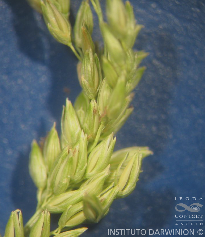 Plantas perennes, cespitosas, cortamente rizomatosas; cañas de 15-60 cm de alto, geniculadas y arraigadas hacia la base, luego erguidas, simples a ramificadas en los nudos inferiores y ramificadas o no en los nudos superiores; entrenudos de 2-10 cm de largo, comprimidos, huecos, glabros; nudos glabros, oscuros, comprimidos; vainas de 1,6-8 cm de largo, estriadas, esparcidamente híspidas a glabras, un borde pestañoso, el restante membranáceo; lígulas de 0,4-0,8 mm de largo, membranáceas, cortamente ciliadas en la porción superior; cuello glabro de color castaño claro; láminas linear-lanceoladas, de 4,5-20 cm x 2-5 mm, planas o con los bordes involutos, de base angostada y ápice largamente atenuado, pilosa hacia la base en la cara adaxial y los bordes inferiores, el resto de la superficie glabra. Inflorescencias terminales exertas; pedúnculo de 4-15 cm de largo, cilíndrico, glabro; panojas de 5-20(-25) x 4-10 cm, laxas, difusas, con ramificaciones de segundo orden alternas, divergentes y distanciadas entre sí; eje de las ramificaciones desnudos en la porción basal; ramificaciones de tercer orden cortas, con espiguillas apareadas o solitarias sobre pedicelos cortos; eje principal anguloso, escabriúsculo; pulvínulos castaño-claros, esparcidamente pilosos a glabros; eje de las ramificaciones escabroso, pedicelos de 0,7-2 mm de largo, claviformes, escabriúsculos. Espiguillas de (1,7-)2,2-2,6 x 0,6-0,9 mm, largamente elipsoides, biconvexas, glabras, verdosas o con tintes violáceos; gluma inferior de 0,8-1,2 mm de largo, ovada, ? del largo de la espiguilla, 3(-5)-nervia, nervio medio escabriúsculo, el ápice agudo; gluma superior de 1,6-1,8 mm de largo, generalmente más corta que el antecio superior, 5(-7)-nervia, el nervio medio escabriúsculo; lemma inferior de 1,8-2,5 mm de largo, glumiforme, 5(-7)-nervia; pálea inferior de 2-2,5 x 0,7-1,2 mm, oblonga, papirácea, sobresaliendo a lo largo y ancho de la espiguilla a la madurez; alas manifiestas, cortamente escabriúsculas en los márgenes; flor inferior neutra; antecio superior de 1,7-2,1 x 0,4-0,6 mm, largamente ovoide, pajizo, papiloso, con aguijones en el ápice de la lemma, el resto de la superficie glabra, de ápice agudo a acuminado; lodículas 2, ca. 0,2 mm de largo, conduplicadas; estambres 2; anteras de 0,4-0,6 mm de largo; cariopsis de 1,1-1,2 x 0,4-0,5 mm, largamente ovoide, castaña, hilo oblongo, embrión poco menor de ½ del largo de la cariopsis.