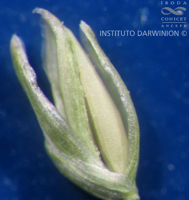 Plantas perennes, cespitosas, cortamente rizomatosas; cañas de 15-60 cm de alto, geniculadas y arraigadas hacia la base, luego erguidas, simples a ramificadas en los nudos inferiores y ramificadas o no en los nudos superiores; entrenudos de 2-10 cm de largo, comprimidos, huecos, glabros; nudos glabros, oscuros, comprimidos; vainas de 1,6-8 cm de largo, estriadas, esparcidamente híspidas a glabras, un borde pestañoso, el restante membranáceo; lígulas de 0,4-0,8 mm de largo, membranáceas, cortamente ciliadas en la porción superior; cuello glabro de color castaño claro; láminas linear-lanceoladas, de 4,5-20 cm x 2-5 mm, planas o con los bordes involutos, de base angostada y ápice largamente atenuado, pilosa hacia la base en la cara adaxial y los bordes inferiores, el resto de la superficie glabra. Inflorescencias terminales exertas; pedúnculo de 4-15 cm de largo, cilíndrico, glabro; panojas de 5-20(-25) x 4-10 cm, laxas, difusas, con ramificaciones de segundo orden alternas, divergentes y distanciadas entre sí; eje de las ramificaciones desnudos en la porción basal; ramificaciones de tercer orden cortas, con espiguillas apareadas o solitarias sobre pedicelos cortos; eje principal anguloso, escabriúsculo; pulvínulos castaño-claros, esparcidamente pilosos a glabros; eje de las ramificaciones escabroso, pedicelos de 0,7-2 mm de largo, claviformes, escabriúsculos. Espiguillas de (1,7-)2,2-2,6 x 0,6-0,9 mm, largamente elipsoides, biconvexas, glabras, verdosas o con tintes violáceos; gluma inferior de 0,8-1,2 mm de largo, ovada, ? del largo de la espiguilla, 3(-5)-nervia, nervio medio escabriúsculo, el ápice agudo; gluma superior de 1,6-1,8 mm de largo, generalmente más corta que el antecio superior, 5(-7)-nervia, el nervio medio escabriúsculo; lemma inferior de 1,8-2,5 mm de largo, glumiforme, 5(-7)-nervia; pálea inferior de 2-2,5 x 0,7-1,2 mm, oblonga, papirácea, sobresaliendo a lo largo y ancho de la espiguilla a la madurez; alas manifiestas, cortamente escabriúsculas en los márgenes; flor inferior neutra; antecio superior de 1,7-2,1 x 0,4-0,6 mm, largamente ovoide, pajizo, papiloso, con aguijones en el ápice de la lemma, el resto de la superficie glabra, de ápice agudo a acuminado; lodículas 2, ca. 0,2 mm de largo, conduplicadas; estambres 2; anteras de 0,4-0,6 mm de largo; cariopsis de 1,1-1,2 x 0,4-0,5 mm, largamente ovoide, castaña, hilo oblongo, embrión poco menor de ½ del largo de la cariopsis.