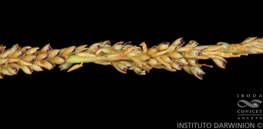 Plantas perennes, cespitosas, cortamente rizomatosas; cañas de 15-60 cm de alto, geniculadas y arraigadas hacia la base, luego erguidas, simples a ramificadas en los nudos inferiores y ramificadas o no en los nudos superiores; entrenudos de 2-10 cm de largo, comprimidos, huecos, glabros; nudos glabros, oscuros, comprimidos; vainas de 1,6-8 cm de largo, estriadas, esparcidamente híspidas a glabras, un borde pestañoso, el restante membranáceo; lígulas de 0,4-0,8 mm de largo, membranáceas, cortamente ciliadas en la porción superior; cuello glabro de color castaño claro; láminas linear-lanceoladas, de 4,5-20 cm x 2-5 mm, planas o con los bordes involutos, de base angostada y ápice largamente atenuado, pilosa hacia la base en la cara adaxial y los bordes inferiores, el resto de la superficie glabra. Inflorescencias terminales exertas; pedúnculo de 4-15 cm de largo, cilíndrico, glabro; panojas de 5-20(-25) x 4-10 cm, laxas, difusas, con ramificaciones de segundo orden alternas, divergentes y distanciadas entre sí; eje de las ramificaciones desnudos en la porción basal; ramificaciones de tercer orden cortas, con espiguillas apareadas o solitarias sobre pedicelos cortos; eje principal anguloso, escabriúsculo; pulvínulos castaño-claros, esparcidamente pilosos a glabros; eje de las ramificaciones escabroso, pedicelos de 0,7-2 mm de largo, claviformes, escabriúsculos. Espiguillas de (1,7-)2,2-2,6 x 0,6-0,9 mm, largamente elipsoides, biconvexas, glabras, verdosas o con tintes violáceos; gluma inferior de 0,8-1,2 mm de largo, ovada, ? del largo de la espiguilla, 3(-5)-nervia, nervio medio escabriúsculo, el ápice agudo; gluma superior de 1,6-1,8 mm de largo, generalmente más corta que el antecio superior, 5(-7)-nervia, el nervio medio escabriúsculo; lemma inferior de 1,8-2,5 mm de largo, glumiforme, 5(-7)-nervia; pálea inferior de 2-2,5 x 0,7-1,2 mm, oblonga, papirácea, sobresaliendo a lo largo y ancho de la espiguilla a la madurez; alas manifiestas, cortamente escabriúsculas en los márgenes; flor inferior neutra; antecio superior de 1,7-2,1 x 0,4-0,6 mm, largamente ovoide, pajizo, papiloso, con aguijones en el ápice de la lemma, el resto de la superficie glabra, de ápice agudo a acuminado; lodículas 2, ca. 0,2 mm de largo, conduplicadas; estambres 2; anteras de 0,4-0,6 mm de largo; cariopsis de 1,1-1,2 x 0,4-0,5 mm, largamente ovoide, castaña, hilo oblongo, embrión poco menor de ½ del largo de la cariopsis.