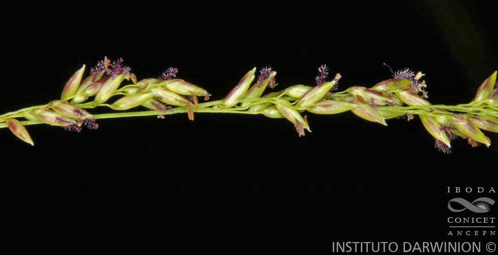 Plantas perennes, cespitosas, cortamente rizomatosas; cañas de 15-60 cm de alto, geniculadas y arraigadas hacia la base, luego erguidas, simples a ramificadas en los nudos inferiores y ramificadas o no en los nudos superiores; entrenudos de 2-10 cm de largo, comprimidos, huecos, glabros; nudos glabros, oscuros, comprimidos; vainas de 1,6-8 cm de largo, estriadas, esparcidamente híspidas a glabras, un borde pestañoso, el restante membranáceo; lígulas de 0,4-0,8 mm de largo, membranáceas, cortamente ciliadas en la porción superior; cuello glabro de color castaño claro; láminas linear-lanceoladas, de 4,5-20 cm x 2-5 mm, planas o con los bordes involutos, de base angostada y ápice largamente atenuado, pilosa hacia la base en la cara adaxial y los bordes inferiores, el resto de la superficie glabra. Inflorescencias terminales exertas; pedúnculo de 4-15 cm de largo, cilíndrico, glabro; panojas de 5-20(-25) x 4-10 cm, laxas, difusas, con ramificaciones de segundo orden alternas, divergentes y distanciadas entre sí; eje de las ramificaciones desnudos en la porción basal; ramificaciones de tercer orden cortas, con espiguillas apareadas o solitarias sobre pedicelos cortos; eje principal anguloso, escabriúsculo; pulvínulos castaño-claros, esparcidamente pilosos a glabros; eje de las ramificaciones escabroso, pedicelos de 0,7-2 mm de largo, claviformes, escabriúsculos. Espiguillas de (1,7-)2,2-2,6 x 0,6-0,9 mm, largamente elipsoides, biconvexas, glabras, verdosas o con tintes violáceos; gluma inferior de 0,8-1,2 mm de largo, ovada, ? del largo de la espiguilla, 3(-5)-nervia, nervio medio escabriúsculo, el ápice agudo; gluma superior de 1,6-1,8 mm de largo, generalmente más corta que el antecio superior, 5(-7)-nervia, el nervio medio escabriúsculo; lemma inferior de 1,8-2,5 mm de largo, glumiforme, 5(-7)-nervia; pálea inferior de 2-2,5 x 0,7-1,2 mm, oblonga, papirácea, sobresaliendo a lo largo y ancho de la espiguilla a la madurez; alas manifiestas, cortamente escabriúsculas en los márgenes; flor inferior neutra; antecio superior de 1,7-2,1 x 0,4-0,6 mm, largamente ovoide, pajizo, papiloso, con aguijones en el ápice de la lemma, el resto de la superficie glabra, de ápice agudo a acuminado; lodículas 2, ca. 0,2 mm de largo, conduplicadas; estambres 2; anteras de 0,4-0,6 mm de largo; cariopsis de 1,1-1,2 x 0,4-0,5 mm, largamente ovoide, castaña, hilo oblongo, embrión poco menor de ½ del largo de la cariopsis.