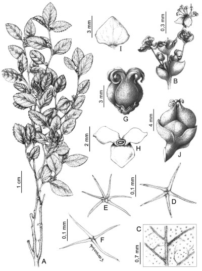 Arbustos monoicos de 30-70 cm de alto, leñosos; troncos hasta de 1 cm de ancho en la base, ramificados dicotómicamente, densamente cubiertos de tricomas estrellados y simples, los de las ramas retrorsos. Hojas con pecíolos de 3-6 mm de largo; estípulas subuladas; láminas elípticas a ovadas, de (2-)2,5-5 × 1,3-2,6(-3) cm, obtusas o agudas, base aguda irregularmente crenado-dentada, ambas caras cubiertas de tricomas estrellados, cara abaxial más clara, con pubescencia más densa y nervaduras prominentes cubiertas de tricomas simples, base 3-nervada y 2-glandulosa. Inflorescencias estaminadas axilares, breves (no excediendo la mitad del largo de la hoja axilante); pedúnculo de 0,5-2 cm de largo, con 4-7 brácteas cupuliformes, de 2-2,5 mm de largo, acuminadas, truncadas o 3-lobadas, densamente pilosas, cada una conteniendo (3-)8(-10) flores; inflorescencias pistiladas terminales, 4-5-floras, flores sésiles, brácteas rígidas, ovadas, de 3-4 mm de largo, carinadas, agudas, pubescentes, ciliadas. Flores estaminadas con 3-4 sépalos ovales ca. 1 mm de largo, agudos, pilosos exteriormente; estambres 7-9 con filamentos engrosados en la base; disco nectarífero formado por glándulas pequeñas, peltadas. Flores pistiladas con 5 sépalos ovales, agudos, ca. 2 mm de largo, ciliados; disco nectarífero pequeño, 3-glandular, irregularmente lobulado; ovario seríceo, estilos 2-fidos. Fruto ca. 7 mm de largo, piloso. Semillas subtetraédricas, de 5 mm de largo, lisas, grisáceas, marmoreadas.