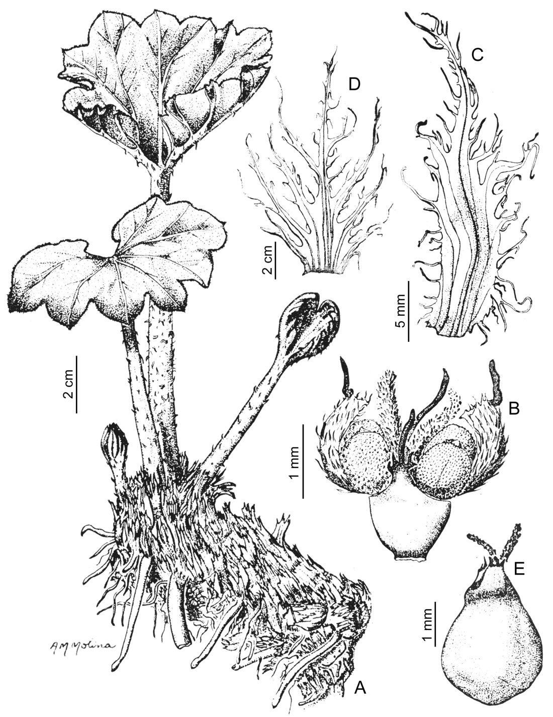Hierbas perennes de gran porte, hasta de 1 m de alto; rizoma horizontal de 10-20 cm de largo × 5-10 cm de diámetro, craso; lepidofi los ovado-triangulares, de 2-10 × 0,5-2 cm, inciso-laciniados, erectos, glabros a glabrescentes, membranáceos, atropurpúreos, con los nervios marcados. Hojas con pecíolos de (11-)20-50 cm de largo × 0,6-3 cm de diámetro, generalmente surcados, con tricomas 1-celulares y proyecciones espinosas cónicas de ca. 5 mm de largo, dispersas, escasas hacia la base y numerosas hacia el ápice; lámina de contorno suborbicular, de 20-70(-100) cm de diámetro, 5-10-lobulada, cada lóbulo triangular, y a su vez sublobulado, base cordada, ápice de los lóbulos de primer y segundo orden agudo a acuminado, el margen con senos irregularmente dentados y prolongados en un mucrón, senos primarios 1/3 de la longitud laminar, cara adaxial lisa o a veces areolada, raramente escabrosa, pilosa, con protuberancias areolares, venas irregularmente pilosas, cara abaxial con venas de primer orden y órdenes mayores pilosas, sin coléteres o protuberancias. Inflorescencia de contorno oblongo-lanceolado, de 6-60 cm de largo; escapo de longitud variable, a veces nulo; raquis piloso, con tricomas adpresos; brácteas obovadas, de 10-37 × 5-6 mm, el margen laciniado, con tricomas escasos y esparcidos, nervio central prominente, pardas; ramificaciones de la inflorescencia de 2-3 cm de largo. Flores distales con cáliz, corola, androceo y gineceo, las de la región media y proximal gradualmente reducidas debido al aborto parcial o total de la corola y el androceo; sépalos triangulares, de 1-2 mm largo, ápice subulado y laciniado, levemente crasos; pétalos 2, obovados, de 2-2,5 × 1-2 mm, cocleariformes, margen irregular y piloso, exteriormente pubérulos, caducos; estambres (1-)2, anteras subelipsoides u orbiculares, ca. 1-1,5 mm de diámetro, apiculadas; ovario subovoide, hasta de 1,2 × 0,75 mm, constricto en el ápice, ramas estigmáticas persistentes. Infrutescencia con ramificaciones crasas, levemente sinuosas. Fruto ovoide, ca. 1,5 mm largo, comprimido, levemente 3-gono, blanco, coronado por las bases diminutas de los sépalos.
