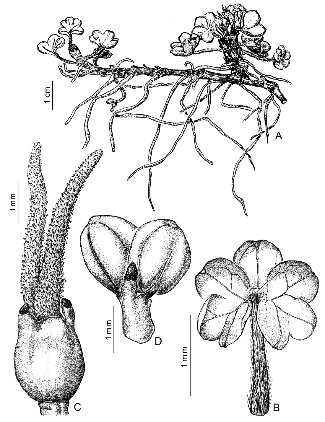 Hierbas perennes, hasta de 10 cm de alto, dioicas; rizoma estolonífero; lepidofi los ovados hasta de 9 × 4 mm, el margen entero, pardos. Hojas con pecíolos de 0,5-6,5 cm largo × 0,5-1 mm de diámetro, glabrescentes hasta densamente pubescentes, púrpureo -oscur os; lámina de contorno orbicular-reniforme, de 1,5 × 2 cm, (5-)7-8 lobuladas y a su vez, 1 a 3 sublobuladas, éstos sublóbulos parcialmente superpuestos y formando senos agudos, ápice redondeado, emarginado, papiloso, cara adaxial lisa, glabra o raramente con escasos tricomas a lo largo del margen entero, cara abaxial glabra, con las venas a veces pubescentes. Infl orescencia estaminada hasta de 5 cm largo; escapo hasta de 4 cm largo. Flores estaminadas con la base de los sépalos deltoides, ca. 1 mm de largo, persistentes; pétalos reducidos, ca. 0,5 mm largo, crasos; estambres 2, filamentos hasta de 5 mm largo, anteras elipsoides, de 1,2-1,5 × 0,75-1 mm, apiculadas. Flores pistiladas con sépalos y pétalos semejantes a las estaminadas; ovario subovoide, de 1,8-2 × 1,6 mm, a veces algo comprimido. Fruto ovoideo-elipsoidal.