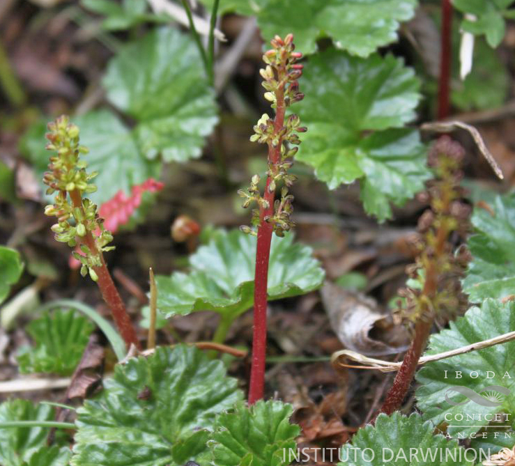 Hierbas perennes hasta de 30 cm de alto, dioicas o raramente polígamas; rizoma estolonífero de 3-4 mm de diámetro; lepidofilos ocreiformes, la cara adaxial glabra y la abaxial a veces estrigosa, el margen entero, con venas conspicuas, glabros, membranosos, pardo-oscuros a translúcidos. Hojas con pecíolos de (2-)5-27 cm de largo × 2-3 mm de diámetro, surcados, escasa a densamente pubescentes, estrigosos; lámina entera , reniforme, de (0,5-)2-6(-10) cm de diámetro, profundamente cordada, cara adaxial lisa, glabra, cara abaxial glabra con las venas pilosas o estrigosas, margen crenado y generalmente mucronado, con algunos coléteres entre las crenas. Infl orescencias estaminadas en tirsos paniculados de 3-4 × 1-1,6 cm; raquis y ramificaciones de la inflorescencia pilosas; escapo de 4-6 cm largo × 1-2 mm de diámetro, estrigoso. Flores estaminadas con pedicelo hasta de 2,5 mm largo; sépalos con la base linear, ca. 0,5-0,8 × 0,2 mm, persistentes; pétalos ausentes; estambres 2, con filamentos de 0,2-0,6 mm largo, anteras oblongo-elipsoides, de 1,5-2,5 × 0,75-1,2 mm, ligeramente apiculadas, atropurpúreas o pardo-oscuras. Inflorescencias pistiladas en tirsos estaquioides, a veces ramificadas hacia la base, hasta de 2,5 × 1,5 cm, densifloras, moradas; raquis estrigoso; escapo de 1 × 0,2 cm, estrigoso. Flores pistiladas sésiles o con pedicelos hasta de 1 mm largo; sépalos con la base linear, ca. 0,75 mm largo, incurva, caduca; pétalos ausentes; ovario cilíndrico, de 1-1,4 × 0,75-1 mm; estilos 2, ca. 5 mm largo, ramas estigmáticas cilíndricas, ca. 6 mm de largo, ligeramente aplanadas hacia el ápice, persistentes, púrpureas. Fruto una baya globosa a subglobosa, de 3-3,2 × 3 mm, amarillo-rojiza, coronada por la base del estilo. Semillas obovoides, ca. 2 × 1 mm.