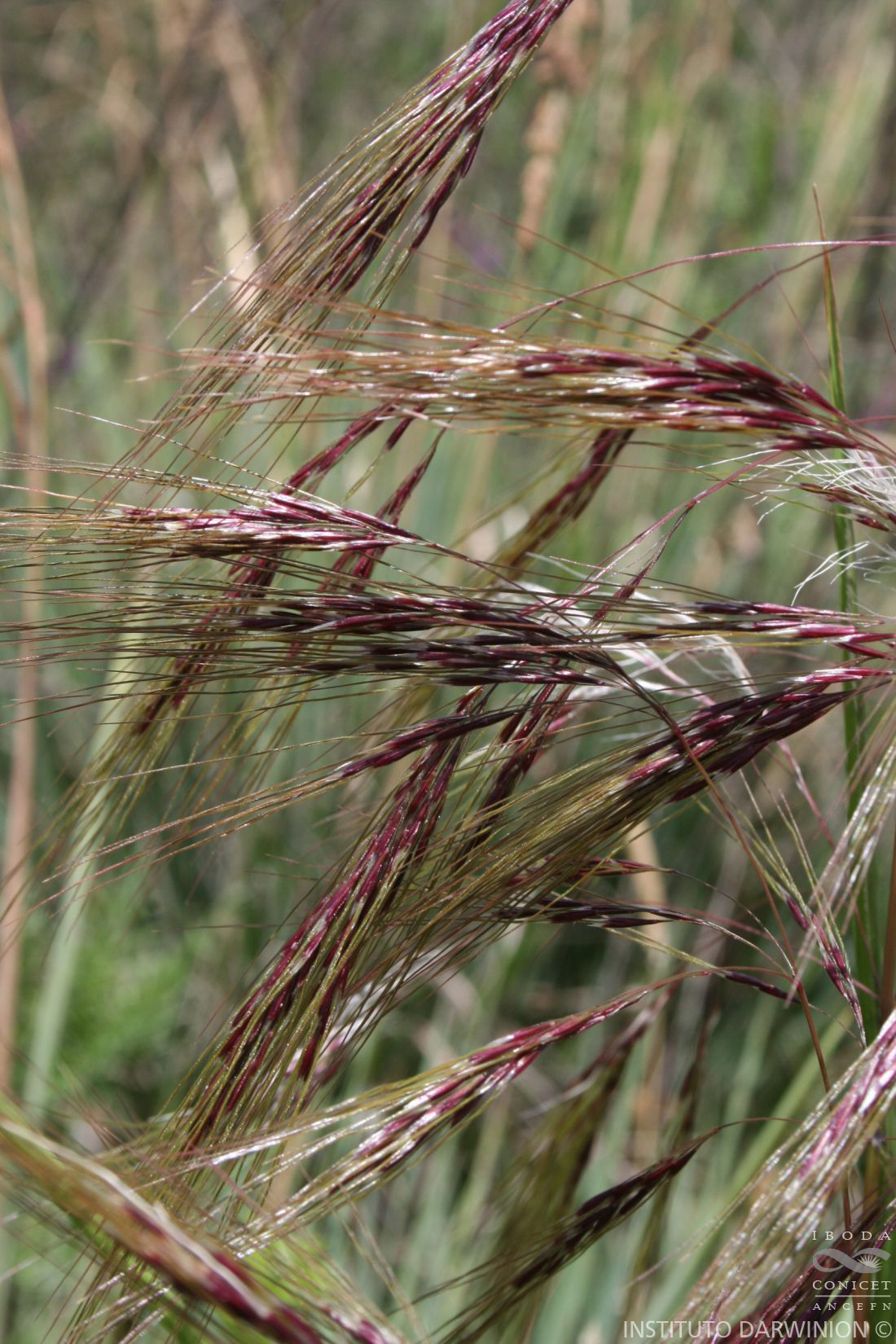 Plantas perennes, cespitosas, robustas, de 50-150 cm de alto; cañas cilíndricas, ca. 2-3 mm de diámetro, erguidas, rectas, simples, paucinodes; nudos comprimidos, conspicuos, castaño-oscuros, glabros; entrenudos longitudinalmente estriados, verdosos, glabros; vainas foliares estriadas, pubérulas o glabras, menores que los entrenudos, pajizas, con bordes pubérulos o vilosos; lígulas truncadas, menores de 1 mm de largo, membranáceas, glabras, con margen entero, ligeramente ondeado, glabro; láminas foliares lineares convolutas o planas, hasta de 60 cm x 6-14 mm, ambas caras estriadas y glabras, ocasionalmente algo vilosas, principalmente hacia los bordes. Inflorescencia erguida o nutante, pluriflora, extendida, de 30-40 cm de largo; raquis, ramas y pedicelos angulosos, híspidos sobre los ángulos. Espiguillas fusiformes, de 8-9 mm de largo; glumas subiguales, de 7-10 mm de largo, mayores que el antecio, atenuadas, membranáceas, violáceas, hialinas hacia el ápice, glabras, hispídulas sobre los nervios, 3-nervias; lemma cilíndrico-fusiforme, levemente angulosa, de 4,5-5 x 0,8-0,9 mm de diámetro, papilosa en toda la superficie, con macropelos densos blanquecinos sobre los nervios hasta cerca de la corona, llegando a la misma en el nervio dorsal; corona conspicua, continua con el cuerpo de la lemma, blanquecina, a veces rojiza en la base, de 0,3-0,5 mm de alto, con margen provisto de hilera de macropelos; arista 2-geniculada a irregularmente sinuosa, de 4- 5 cm de largo, escabriúscula, robusta, persistente; antopodio agudo, de 1,5-1,7 mm de largo, densamente viloso; pálea hialina, de 0,8-1 mm de largo, enervia, glabra; lodículas 2, lineares u oblongas, ca. 1 mm de largo; cariopsis subcilíndrica, castaña, de 2,5-3 mm de largo.