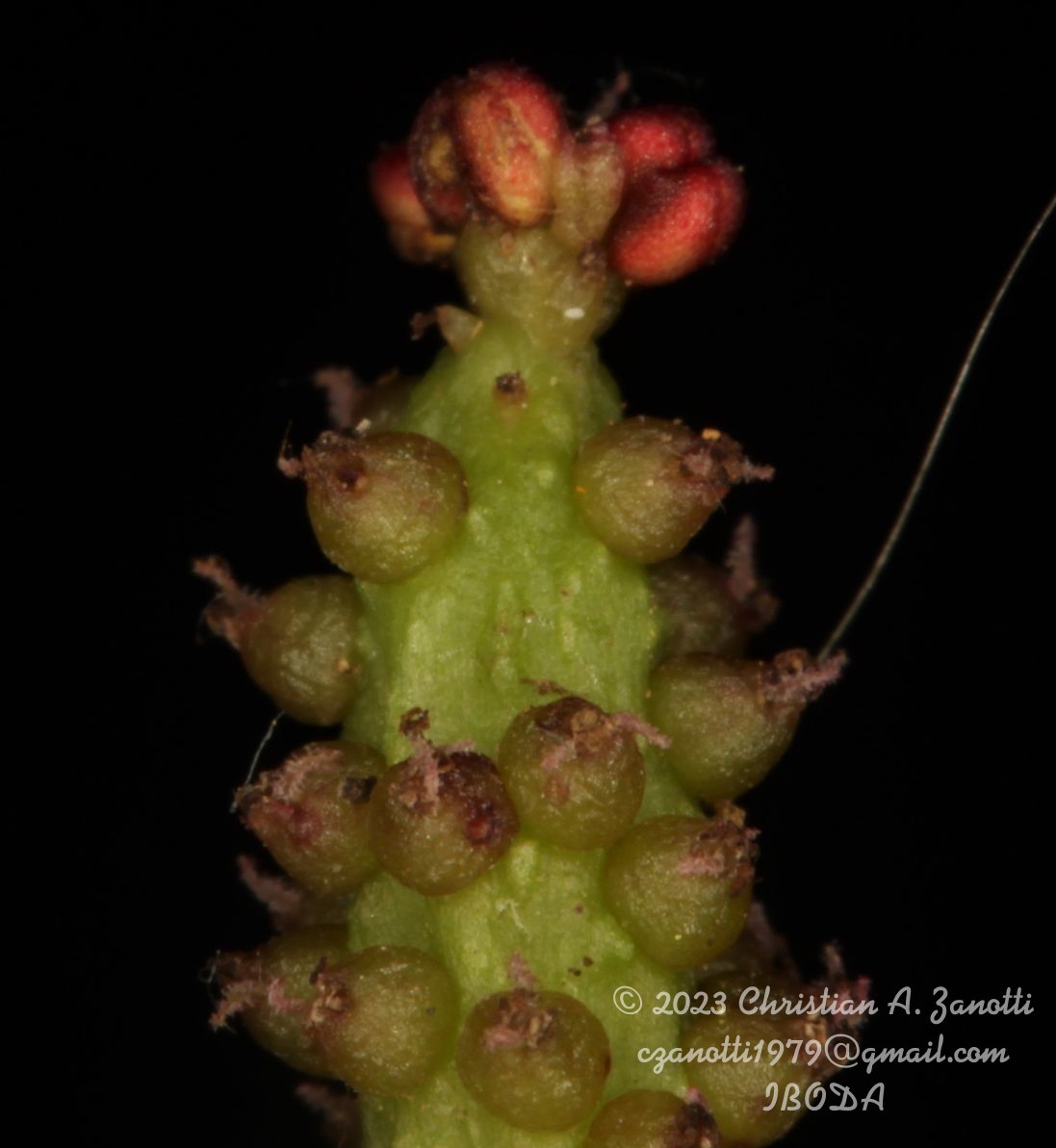 Hierbas perennes de porte mediano a grande, hasta de 3,5 m de alto; rizoma de magnitud variable, craso; lepidofilos numerosos, angosto-ovados, de 3,5-30 × 1-1,5 cm, a veces laciniado-incisos, de ápice agudo, pubérulos en ambas caras, membranáceos, con nervios marcados. Hojas con pecíolo de 12-15 cm de largo, canaliculado, craso, piloso o glabro, con proyecciones cónicas espinosas ca. 4 mm de largo; lámina de contorno orbicular o suborbicular, de 0,3-80 × 0,3-1 m, base cordada, ápice redondeado, agudo u obtuso, 5-7(-9) lobuladas, profundidad de los senos foliares 1/2-1/4 de la longitud de la lámina, con 1-3 sublóbulos, éstos con ápice agudo, subobtuso, a veces mucronado, con dientes marginales agudos, cara adaxial glabra, rara vez pubescente, lisa o escabrosa, con o sin protuberancias areolares, cara abaxial con venas prominentes, crasas o no, con o sin coléteres, purpúreas a pardo-oscuras, pilosas, rara vez pequeñas y distantes, venas de primer orden generalmente pilosas, venas de orden mayor siempre pilosas, margen entero o dentado. Inflorescencia sésil o con escapo hasta de 8 cm largo, surcado, pubérulo o glabro, y ramificaciones de 1,5-45 cm largo, glabras, crasas, sinuosas o rectas; raquis hasta de 40 cm de largo; brácteas lineariformes a angostamente ovadas, de 5-25 × 0,3-1 mm, esparcidamente pilosas, el margen entero o laciniado-flagelado, el ápice levemente laciniado, a veces mucronadas, con el ápice caduco o persistente. Flores sésiles o cortamente pediceladas, las distales con cáliz, corola, androceo y gineceo, las de la región media y proximal gradualmente reducidas debido al aborto parcial o total de la corola y el androceo; sépalos con base subtriangular, de 0,25-1 mm de largo, crasos, glandulares, laciniados en la región distal, al crecer recurvados, atropurpúreos; pétalos 2, obovados, de 2,5 × 5 mm, cocleariformes, ápice mucronado, glabros; estambres 2, anteras orbiculares, a veces suborbiculares, ovoides o elipsoides, de 0,75-1 mm de diámetro; ovario globoso o subgloboso, de 0,75-1 × 0,30-0,75 mm. Infrutescencia de contorno oblongo-elipsoide, de 15-45 × 2-14 cm, atenuada hacia el ápice; subsésil o a veces con escapo hasta de 10 cm de largo; raquis levemente piloso y con ramificaciones de 3-5,5 cm largo, glabros, a veces ligeramente crasos, erectos o a veces sinuosos. Frutos lenticular-compresos o a veces globosos, ligeramente 3-gonos, de 1,5-2 mm de diámetro, pericarpio tenue y blanco, coronados por las bases diminutas de los sépalos, laxamente dispuestos, sésiles, generalmente blanco-amarillentos. Var. tinctoria.- Venas de la lámina foliar crasas, con proyecciones espinosas en la cara abaxial; brácteas de la inflorescencia de 20-25 × 0,6-1 mm, el margen entero; base de los sépalos diminuta, calliforme.