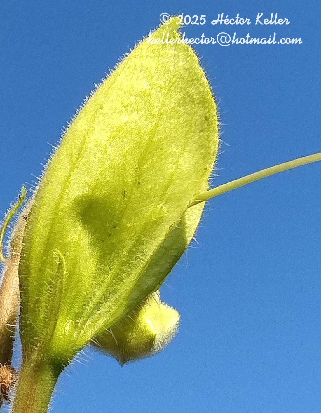 Hierbas anuales hasta de 50 cm de alto, pubescentes y viscosas; tallos cilíndricos, fistulosos, de ramificación cimoso-dicotómica. Hojas opuestas, pecíolos pubescentes hasta de 20 cm de largo; láminas ovado-cordadas o reniformes, cordadas en la base, obtusas, enteras o dentadas, densamente pubescentes en la haz. Inflorescencias en racimos terminales 28-30-floros, hasta de 30 cm de largo; pedicelos con bráctea lineares caducas en su base y con 2 bractéolas lineares debajo del cáliz. Cáliz espatáceo, membranáceo, inflado, entero, 3-5 dentado en el ápice, dorsalmente; ventralmente glabro, dorsalmente villoso; corola subcampanulada, blanca, de 16-18 cm de largo, garganta con manchas color castaño o morada en su interior; tubo corolino 4-5 veces la longitud del cáliz; limbo de 5 lóbulos redondeados, extendido, ca. 6 cm de diámetro; estambres 4, didínamos, sin estaminodios; ovario pequeño, ovalado, glabro; estilo largo; estigma 2-fido. Cápsulas leñosas, ovoides, ca. 5 × 3 cm, cara inferior lisa y globosa, cara superior con cresta de espinas y ápice con 2 apéndices cortos. Semillas 4-5, alargadas y encorvadas, con testa negra, coriáceas.